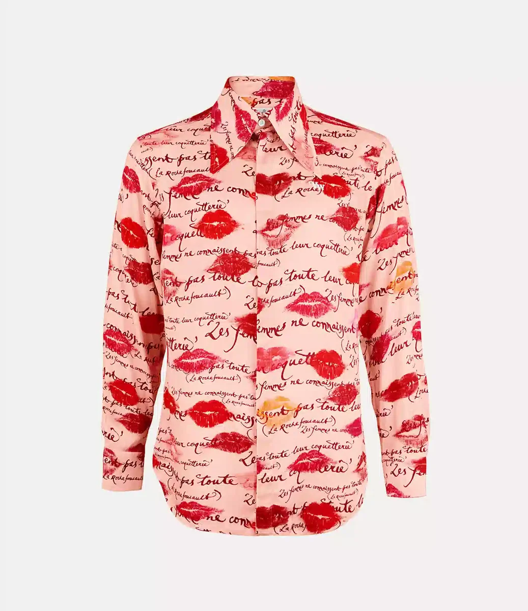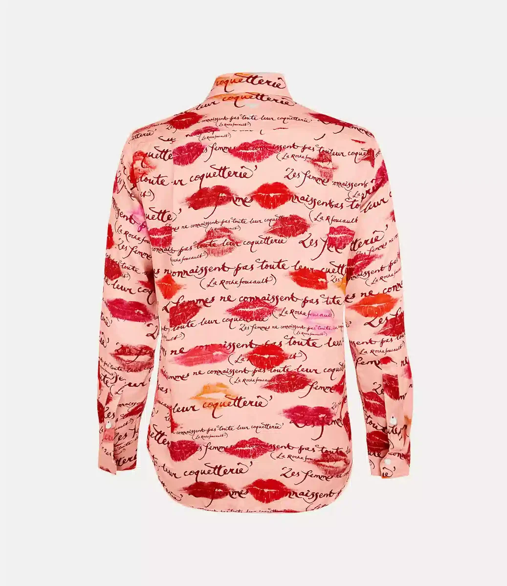 Smokin gömleğimiz, gizli düğme patı ile tamamlanan abartılı sivri yakaya sahiptir. Bu parça, ‘Boudoir’ parfüm ambalajımızdan ilham alan ‘Kisses’ sanat eseri ile süslenmiştir ve Vivienne’in el yazısı ‘Les Femmes Ne Connaissent Pas Toute Leur Coquetterie’ motifi ile kaplanmıştır.