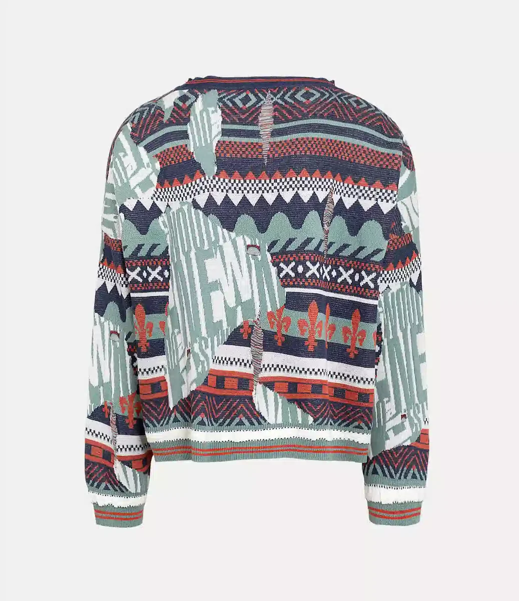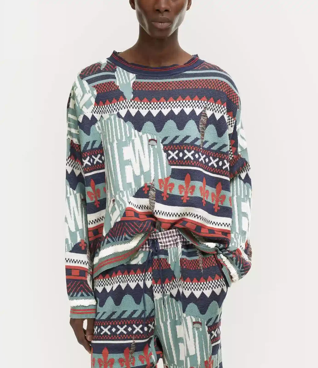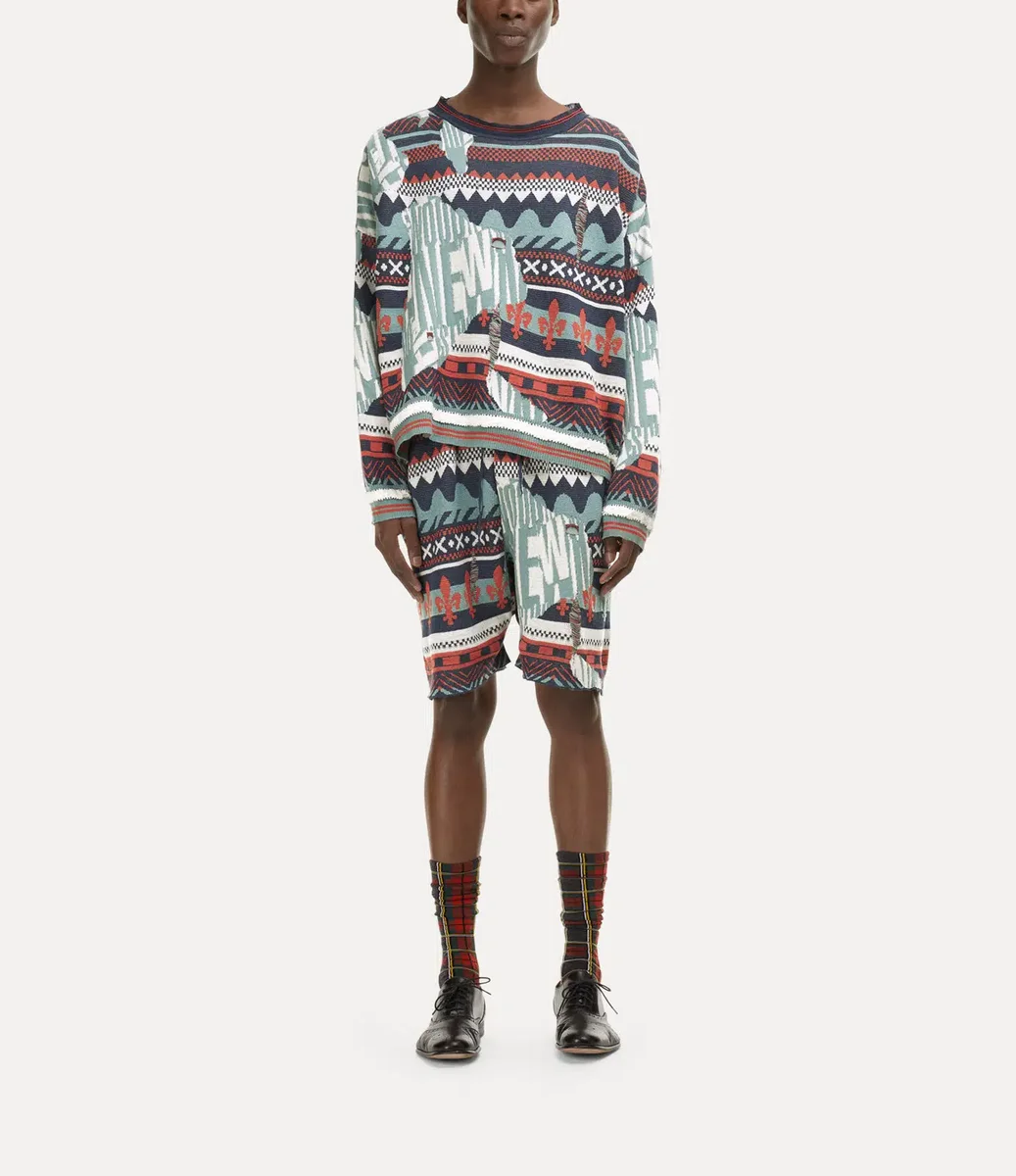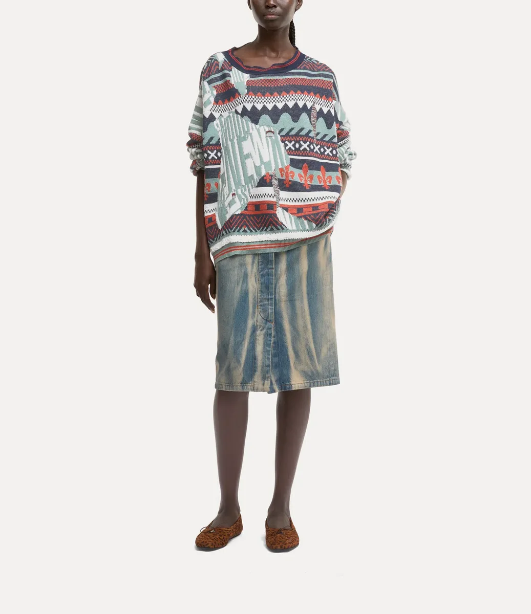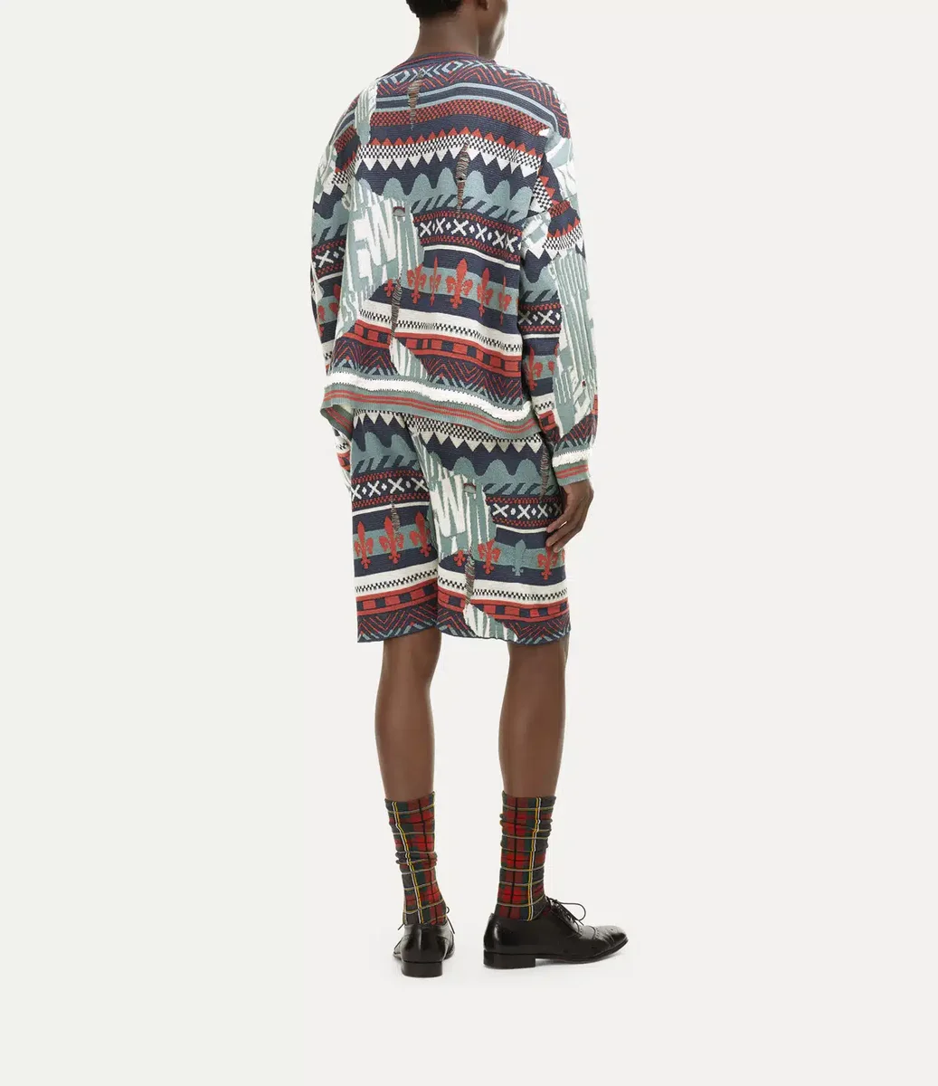 Broken Fair Isle kazak, bu sezonun Fair Isle jakarını, markanın imza ikonografisiyle dokunmuş ve “Vivienne Westwood” yazısının motifinin ince bir şekilde ortaya çıktığı soluk bölümlerle sunuyor. Parça, karmaşık yıpranmış detaylarla tamamlanarak dekonstrüktif bir estetik yaratıyor.