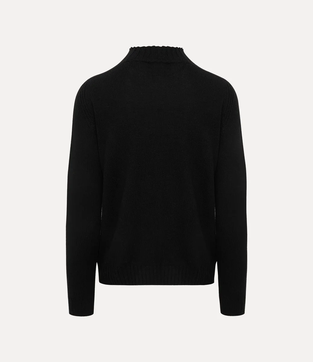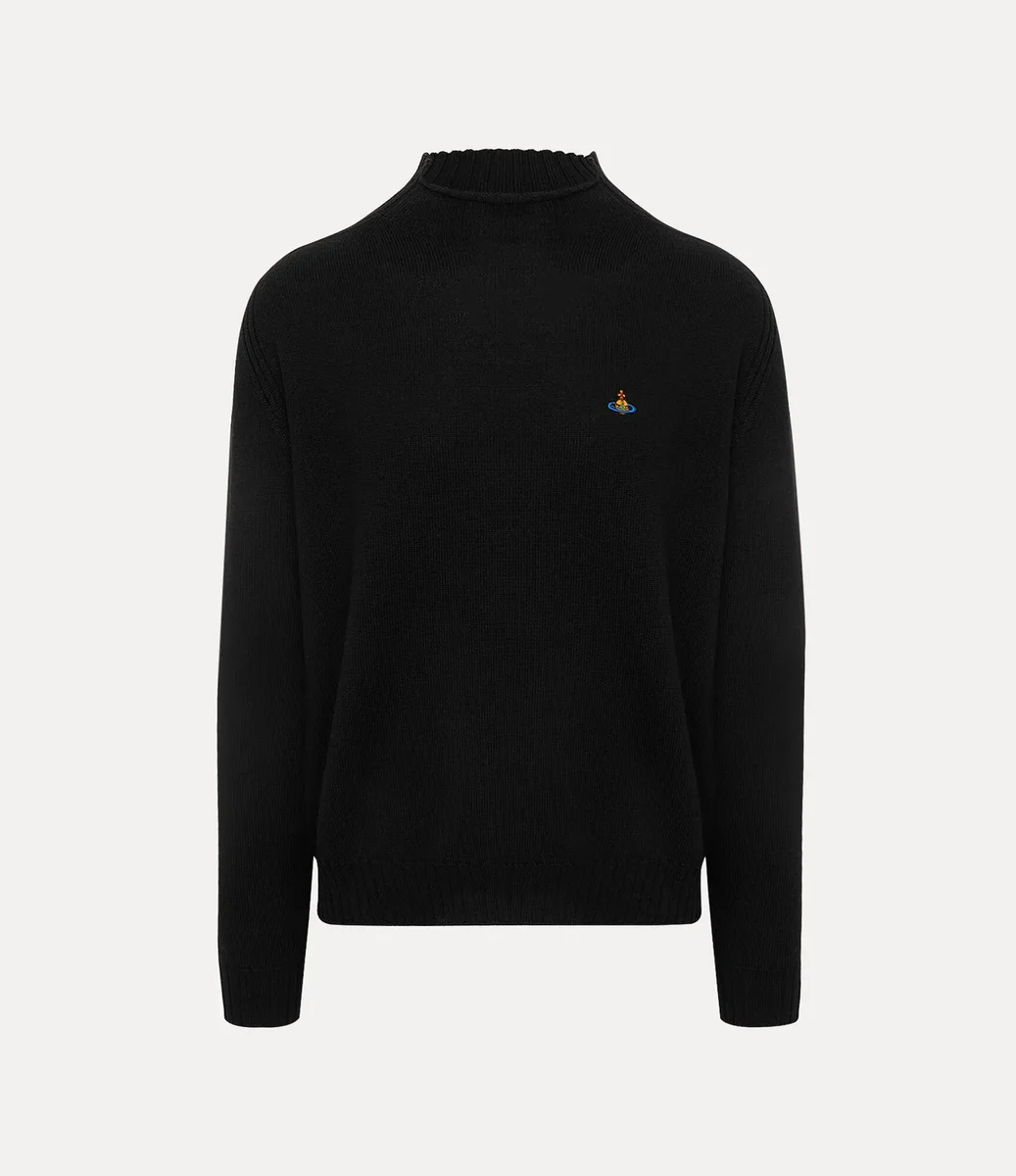 Fisherman kazak, yumuşak yünden üretilmiştir ve düz etek ucu ile uzanan nervürlü yaka detayına sahiptir. Nervürlü manşetli uzun raglan kollu bu parça, Vivienne’in geleneği geleceğe taşıma vizyonunu yansıtan, göğsün sol tarafında çok renkli işlemeli bir küre ile süslenmiştir.