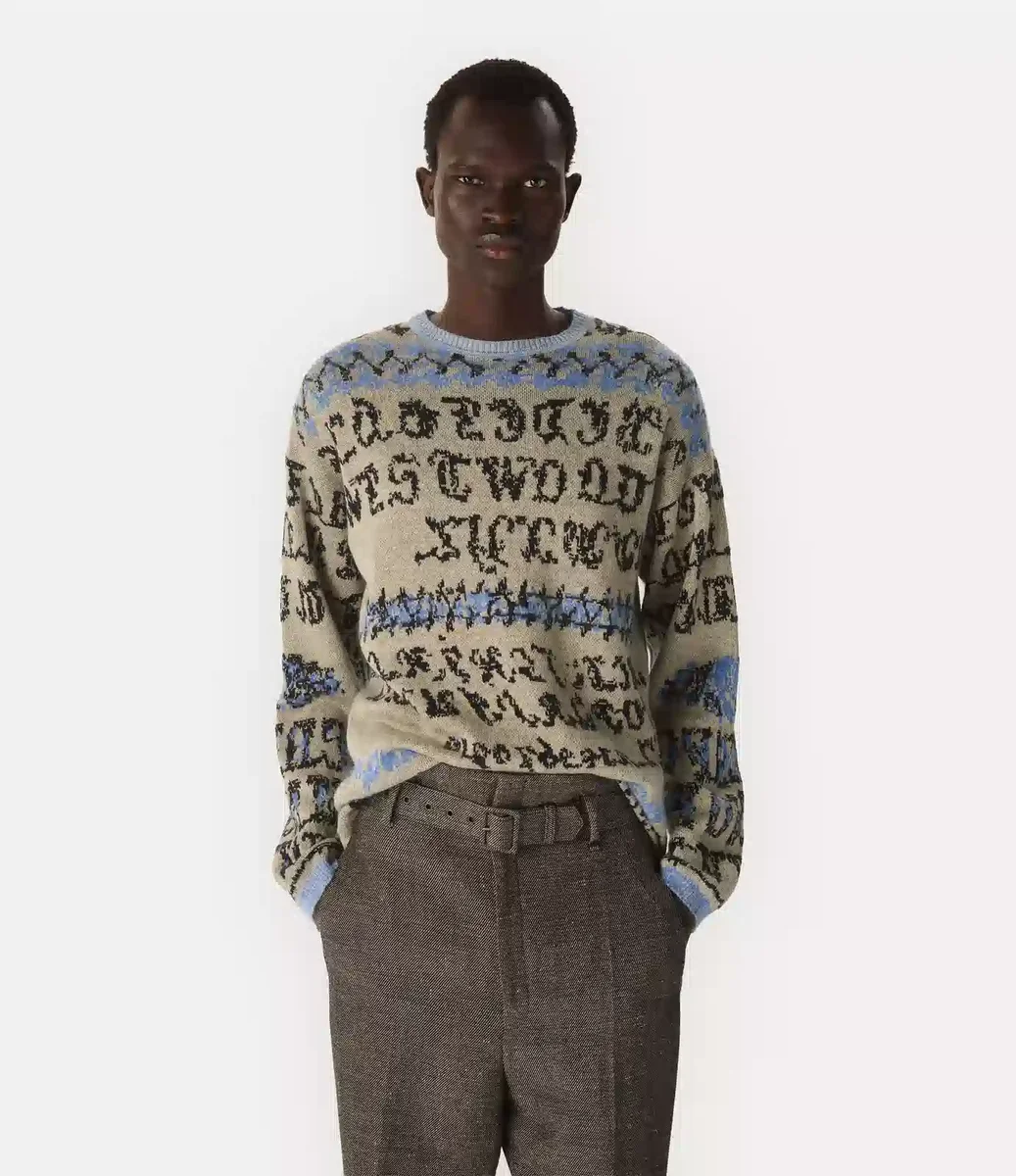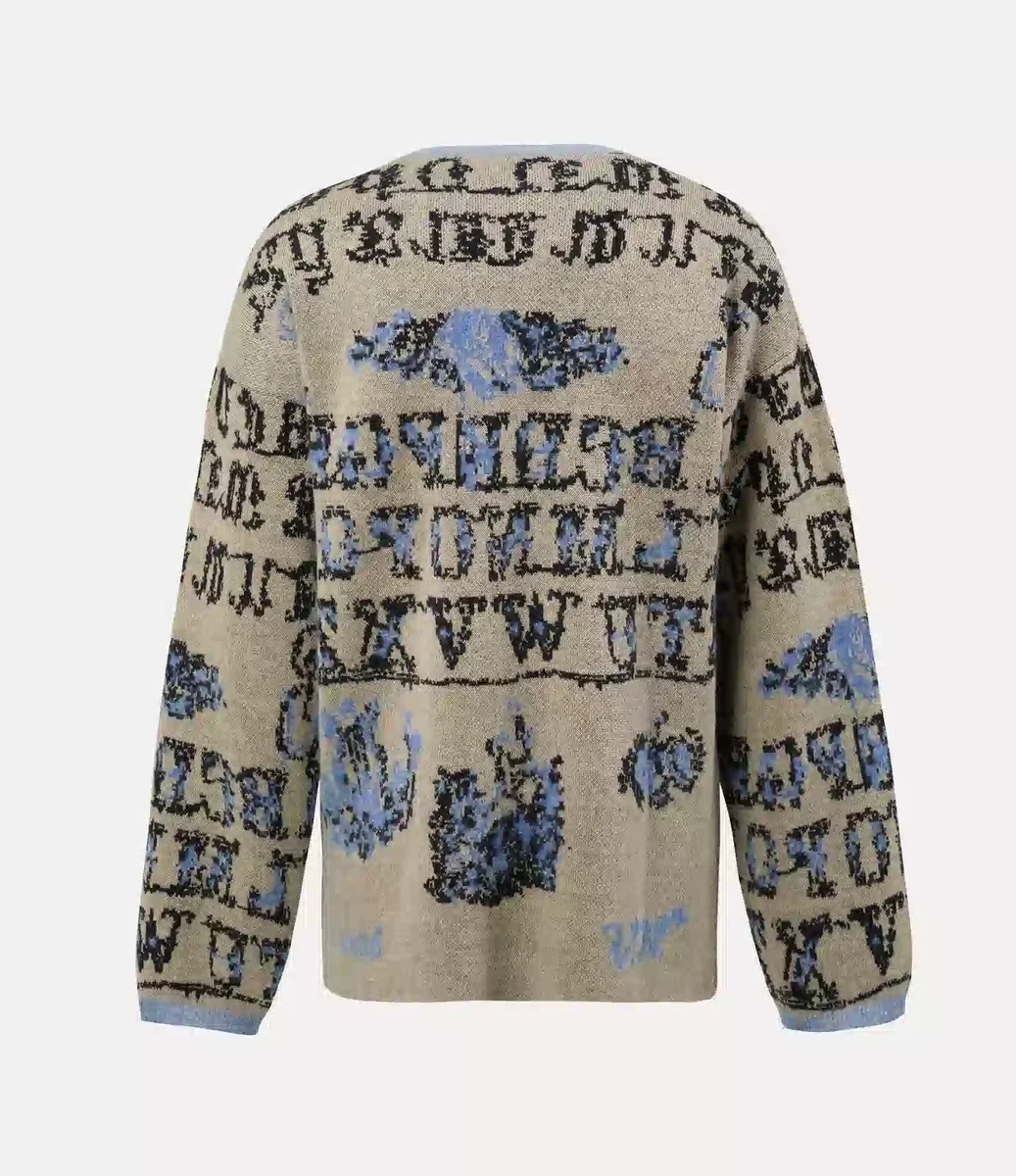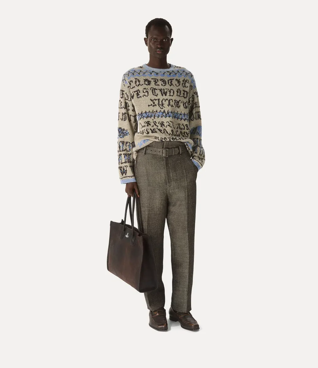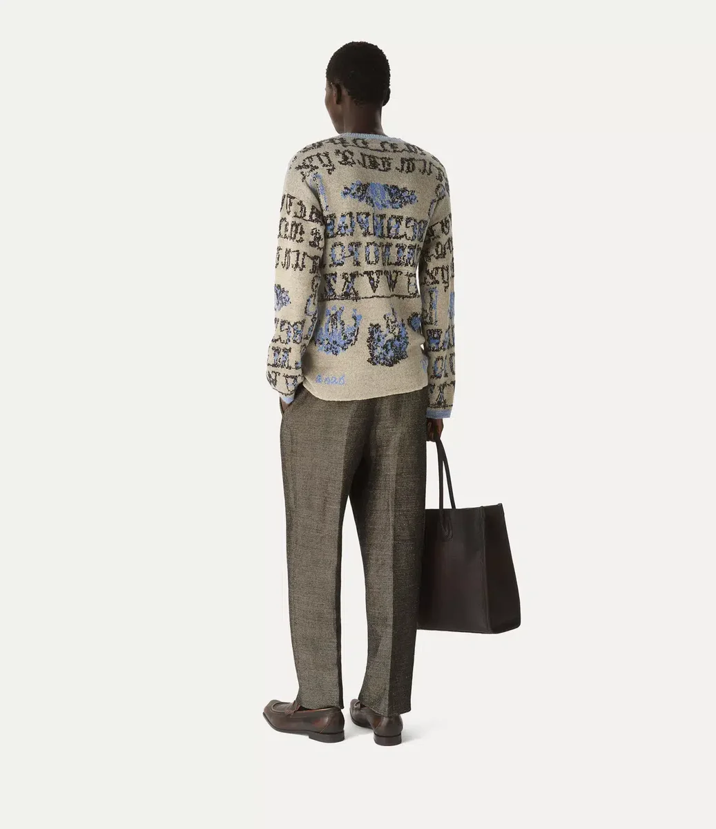 Lili kazak, kenevir, yün ve moher karışımından üretilmiştir ve tasarımına dokunmuş imza niteliğindeki “VW” monogramı ile tamamlanan, duvar halısından ilham alan jakar desenine sahiptir. Hafifçe düşen omuzlarla kesilen bu parça, rahat bir uzun siluete sahiptir ve zarif ribana kenarlarla tamamlanmıştır.
