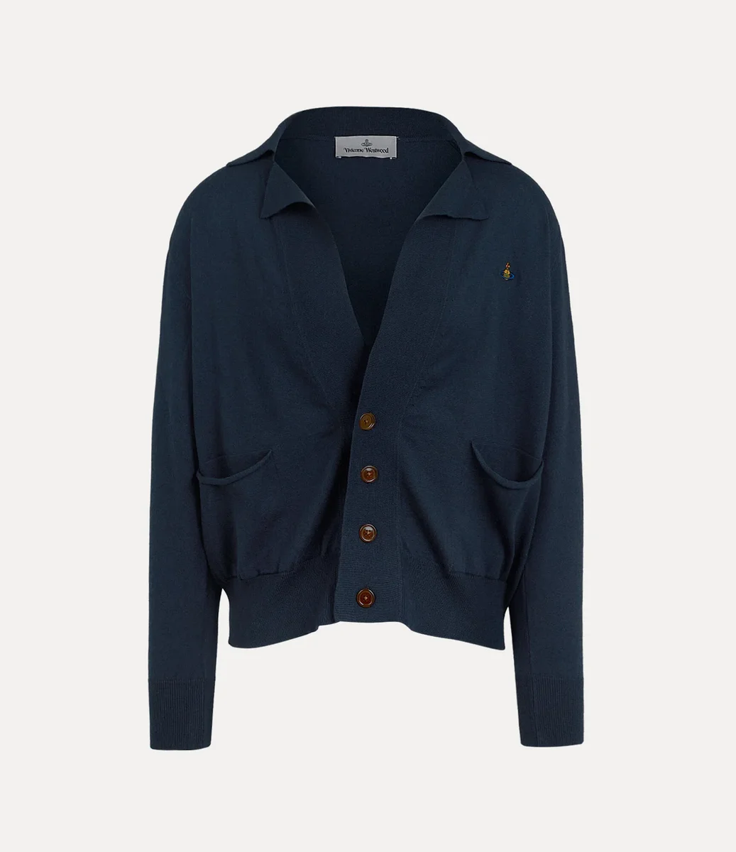 Vivienne Westwood Samuel hırka, pamuk-kaşmir karışımı, açık yaka ve V yakalıdır, kehribar düğmelerle vurgulanmıştır.