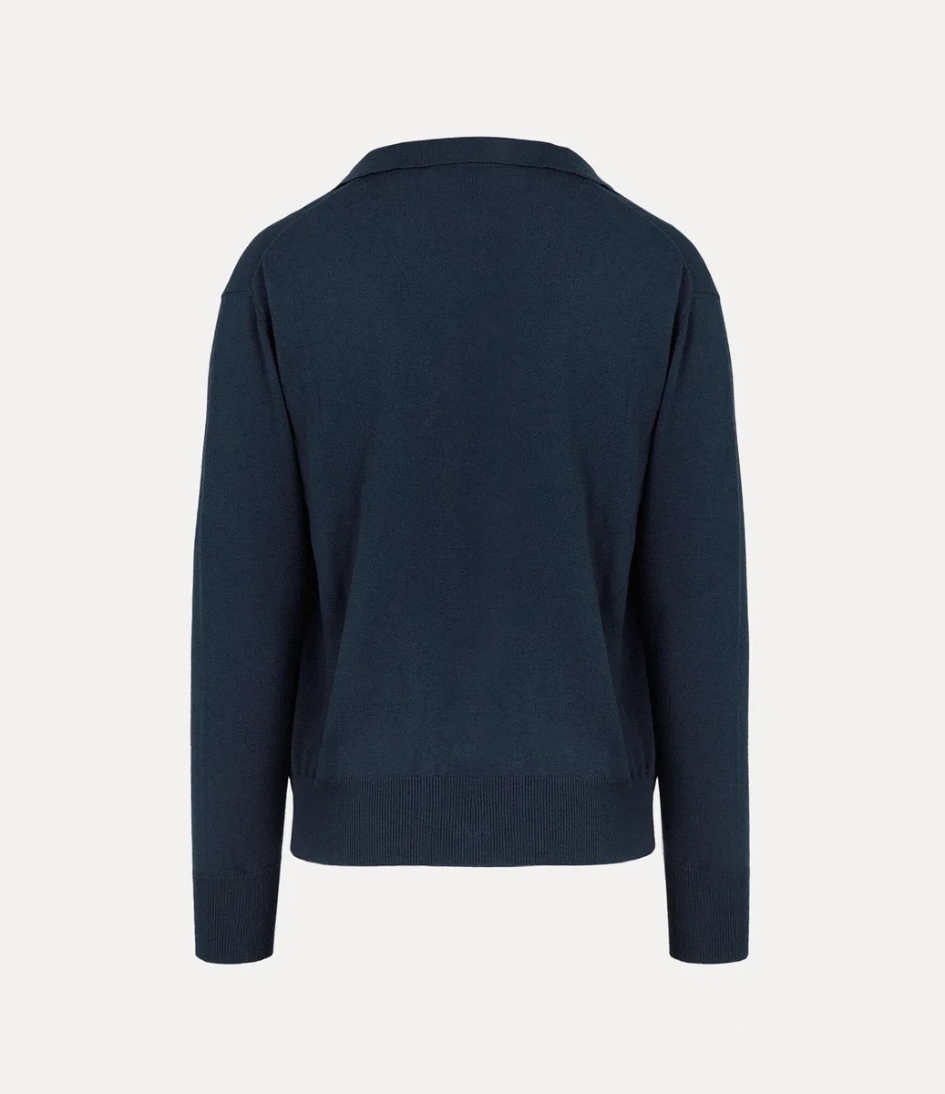 Samuel hırkamız, düz açık yakalı ve V yakalıdır ve ön tarafında kehribar rengi düğmelerle vurgulanmıştır. Göğsün sol tarafında işlemeli küre ile tamamlanan bu parça, Vivienne’in geleneği geleceğe taşıma vizyonunu yansıtmaktadır.