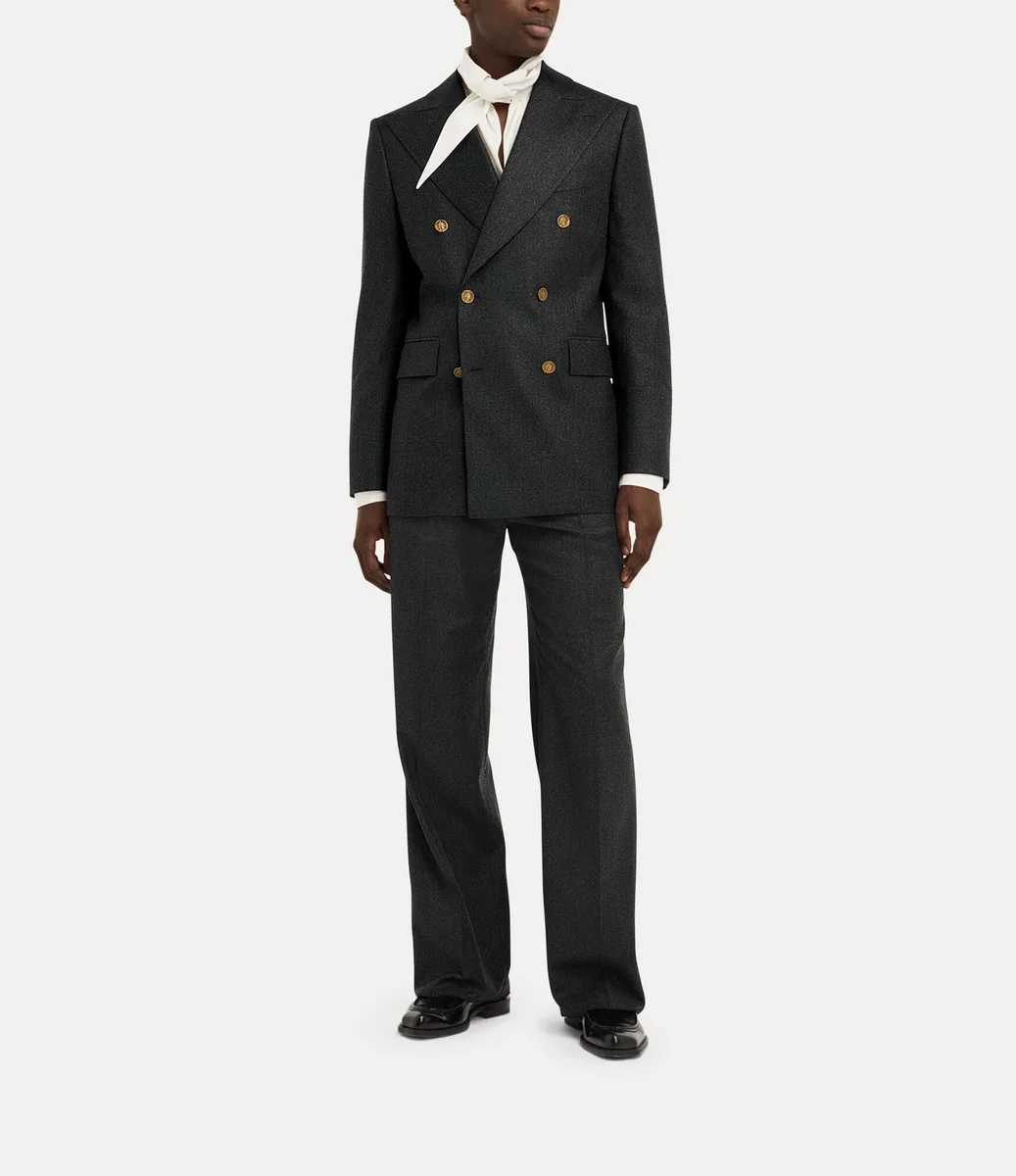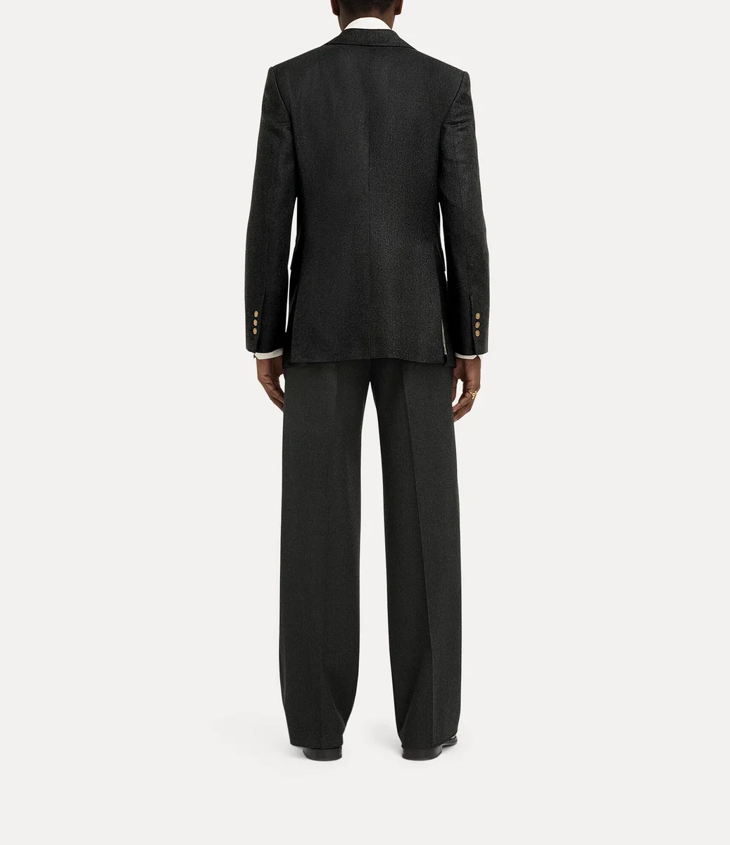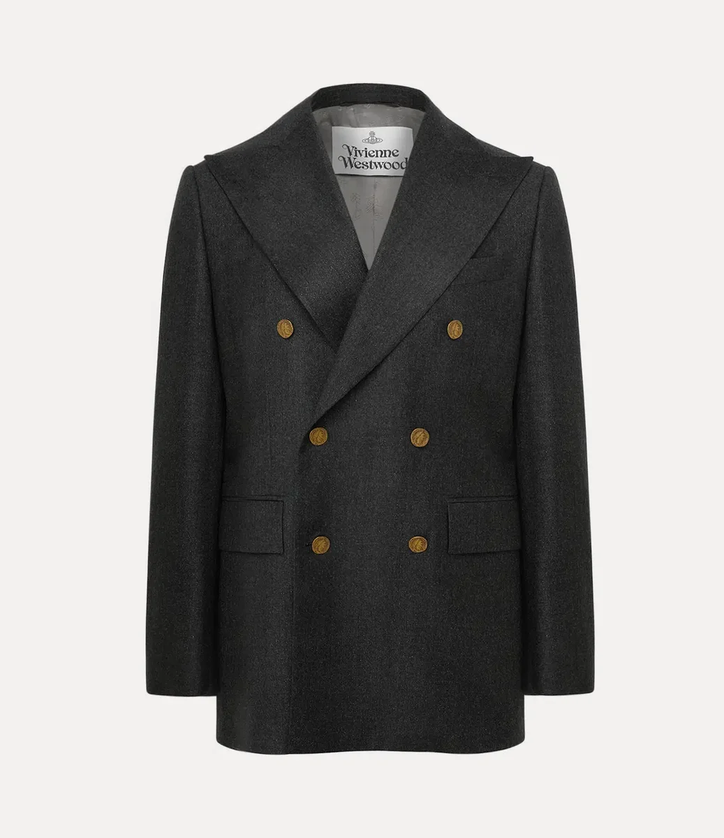 Kaptan ceketimiz, metalik fırçalanmış yüzeye sahip, özenle dokunmuş yün profilden üretilmiştir. Keskin sivri yakalı silueti, arka yırtmaçlı temiz bir etek ucu ile tamamlanmaktadır ve Vivienne’in geleneği geleceğe taşıma vizyonunun simgesi olan ‘Tossed Orb’ iç astarı ile tamamlanmaktadır.