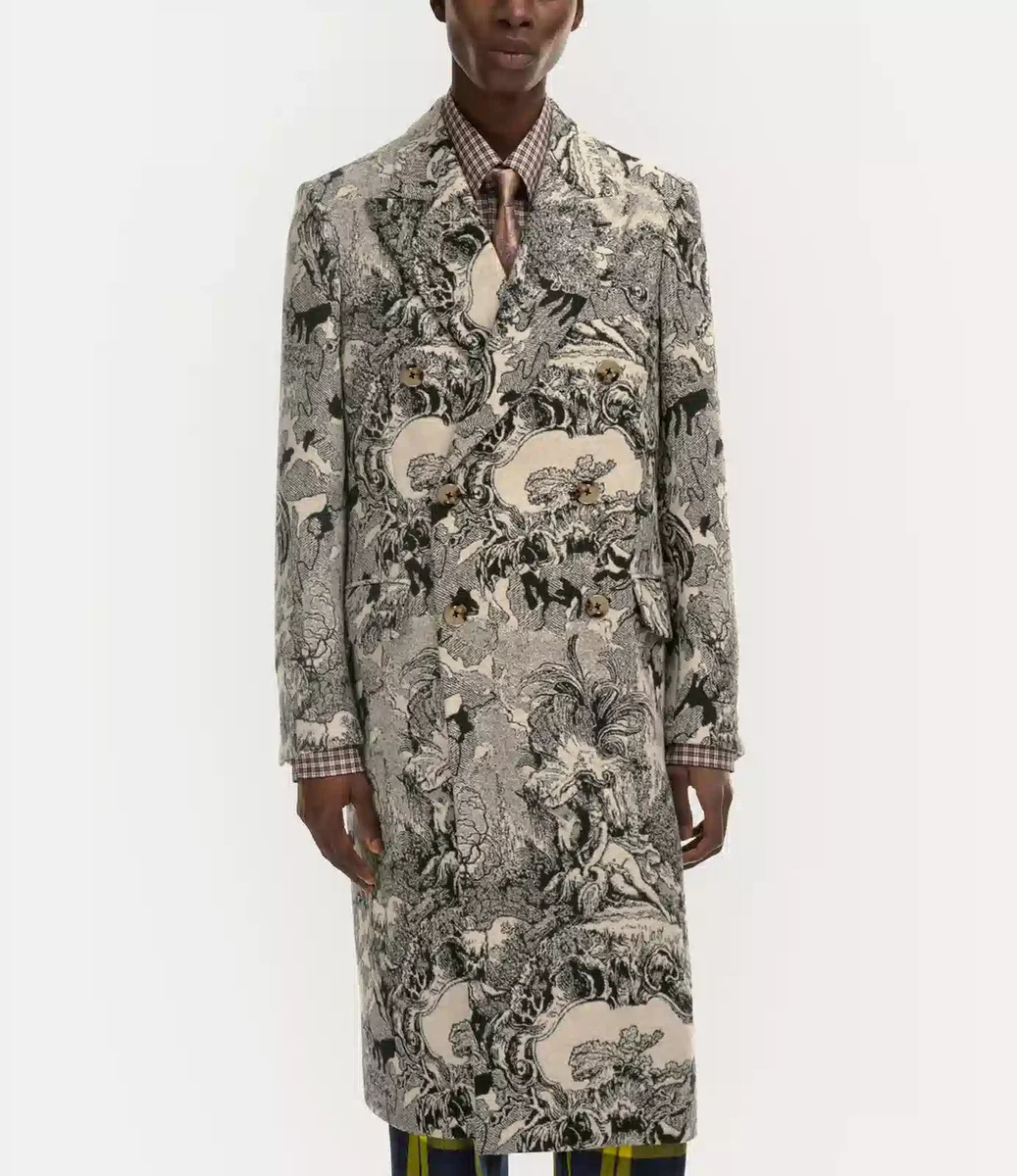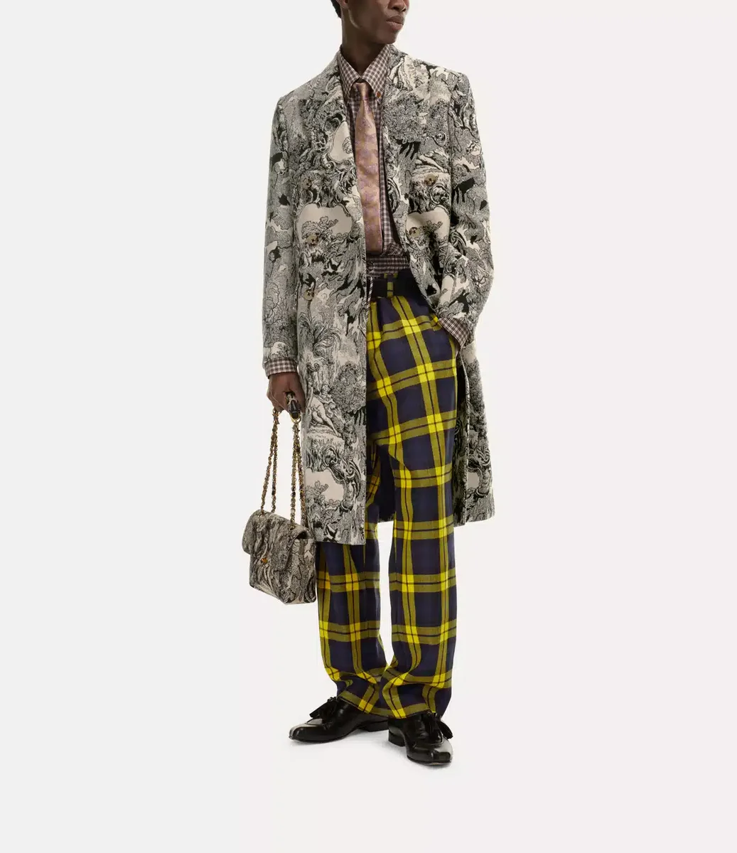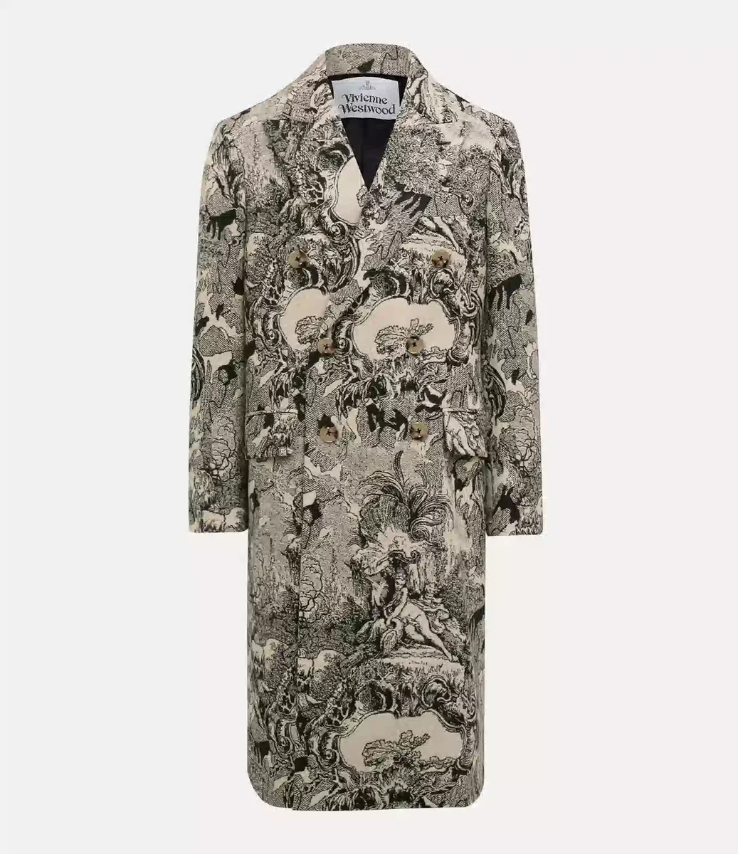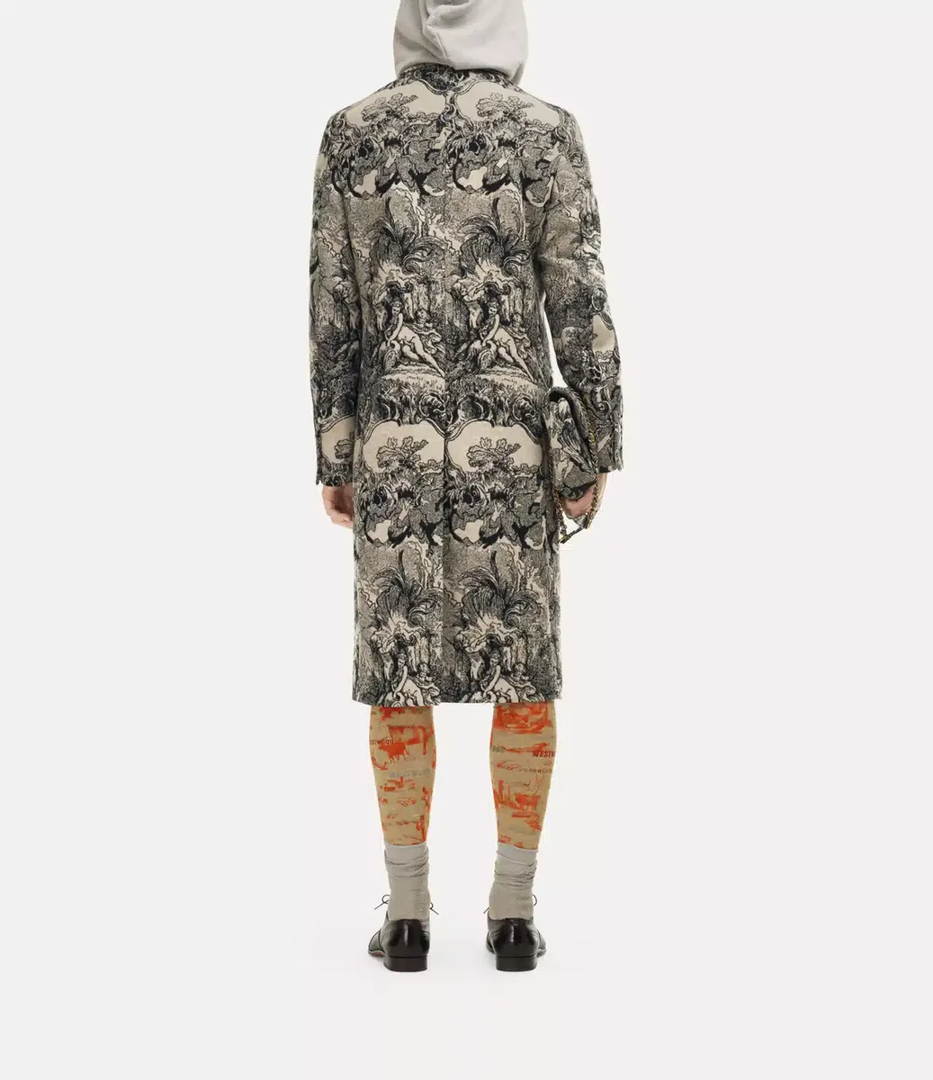 Klasik çift düğmeli paltomuz, zengin fırçalanmış yünden üretilmiştir ve Vivienne’in sanat tarihine olan hayranlığını yansıtan, bu sezonun tek renkli ‘Venus’ jakar desenine sahiptir. Yapısal omuzlar ve geniş çentikli yakalarla tasarlanan bu parça, zarif bir diz boyu siluete sahiptir.