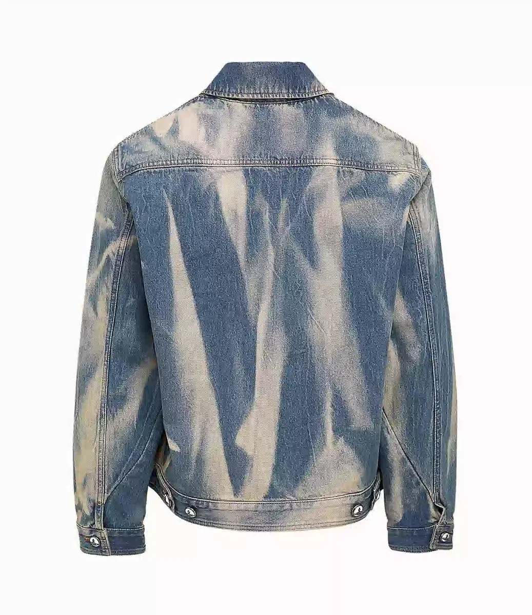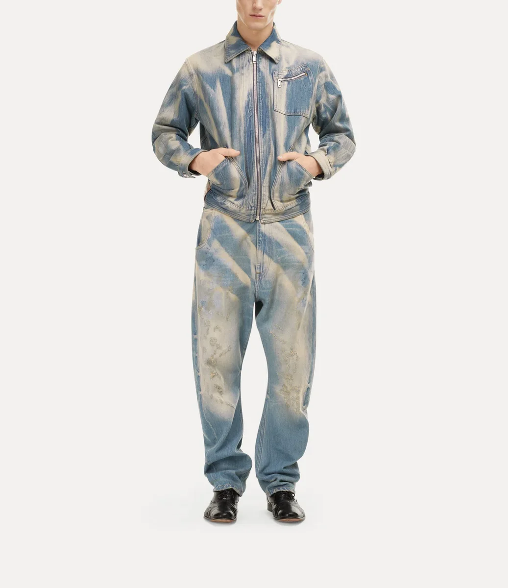 Vivienne Westwood Piranha ceket, soluk indigo yıkama ile süslenmiş pamuklu bir profile sahiptir ve eskitilmiş bir görünüm sunar.