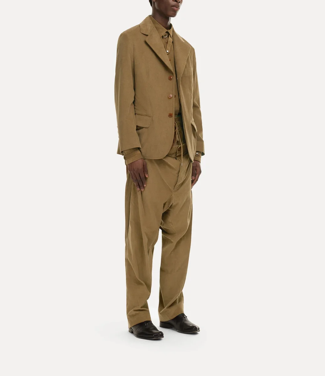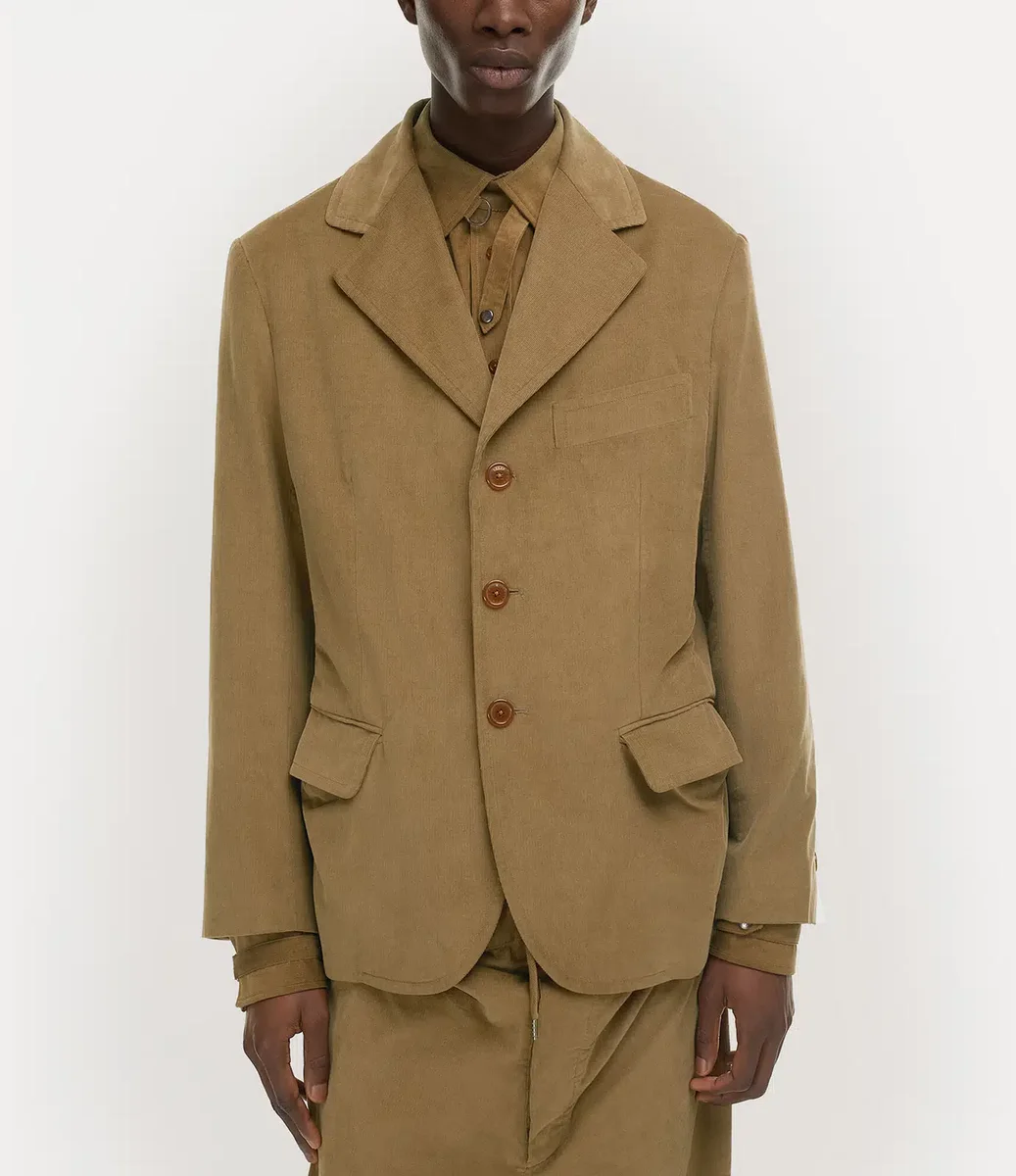 Vivienne Westwood Wreck ceket, yumuşak pamuklu kadife kaplamayla yeniden tasarlandı ve ön kısmında oyulmuş düğme kapamalarıyla tamamlandı.