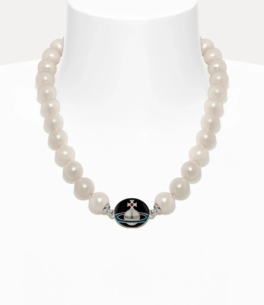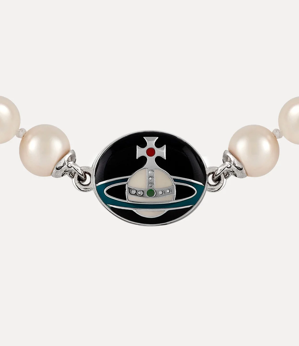 Markanın imza niteliğindeki küre motifi, Vivienne’in geleneği geleceğe taşıma vizyonunu temsil eder. Man. Loelia Büyük İnci kolyemiz, oval, düğme esintili kapatma kısmının ortasına yerleştirilmiş, el boyaması emaye detaylarla tamamlanmış, yenilenmiş bir küre versiyonu sunar.