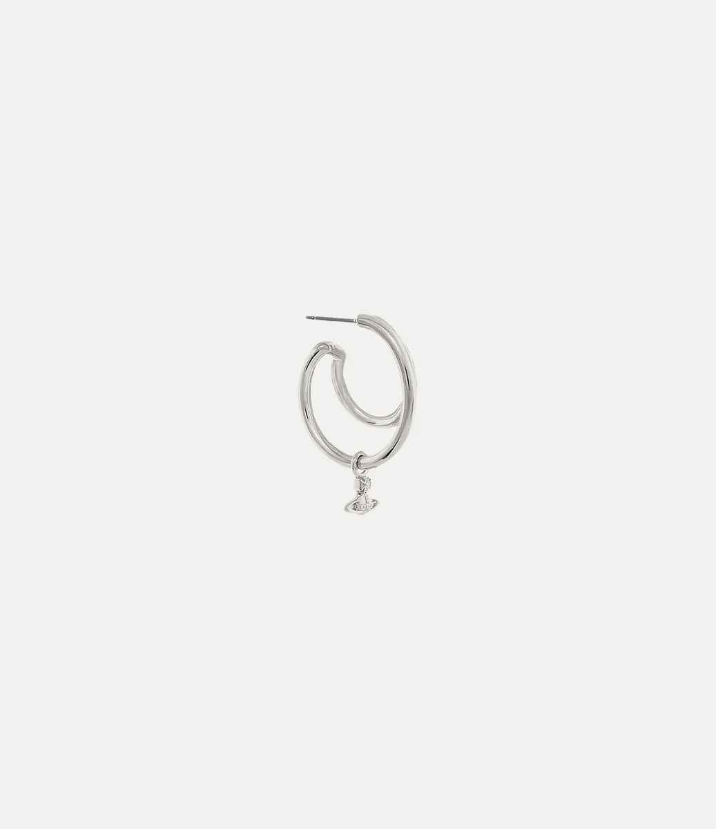 Man. Ronda Tekli Küpe, bu sezonun çift halka siluetini yansıtarak, birden fazla piercing takılmış gibi bir izlenim yaratır. Stil, cilalı gümüş tonlu bir kaplamaya sahiptir ve halkaların arasında zarif bir şekilde duran sarkan küre motifi ile zenginleştirilmiştir.