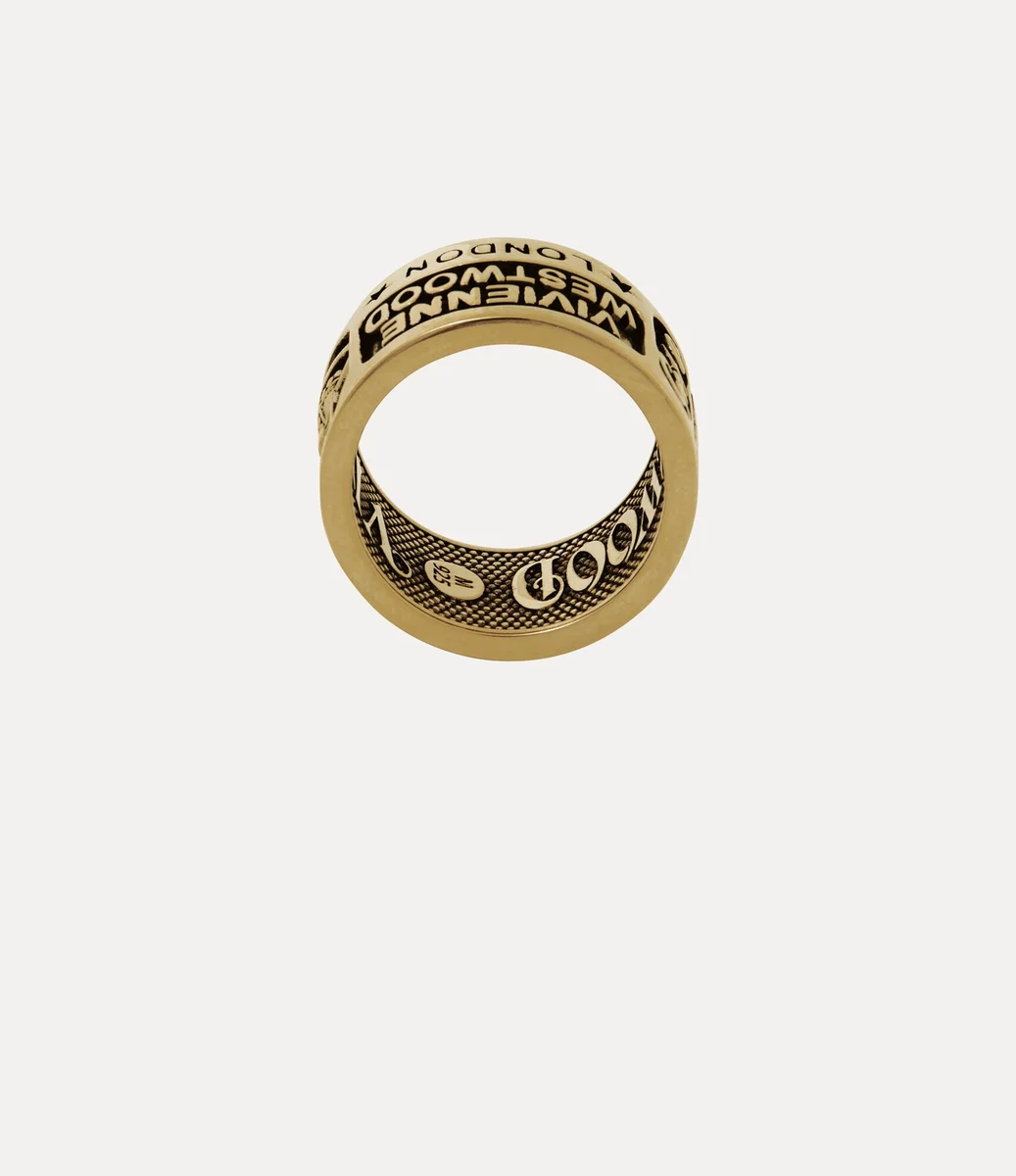 Vivienne Westwood Lancelot yüzük, altın rengi kaplamalı geri dönüştürülmüş gümüşten üretilmiştir ve markanın tarihinden ilham alan imza cümleleri ve motiflerle süslenmiştir.