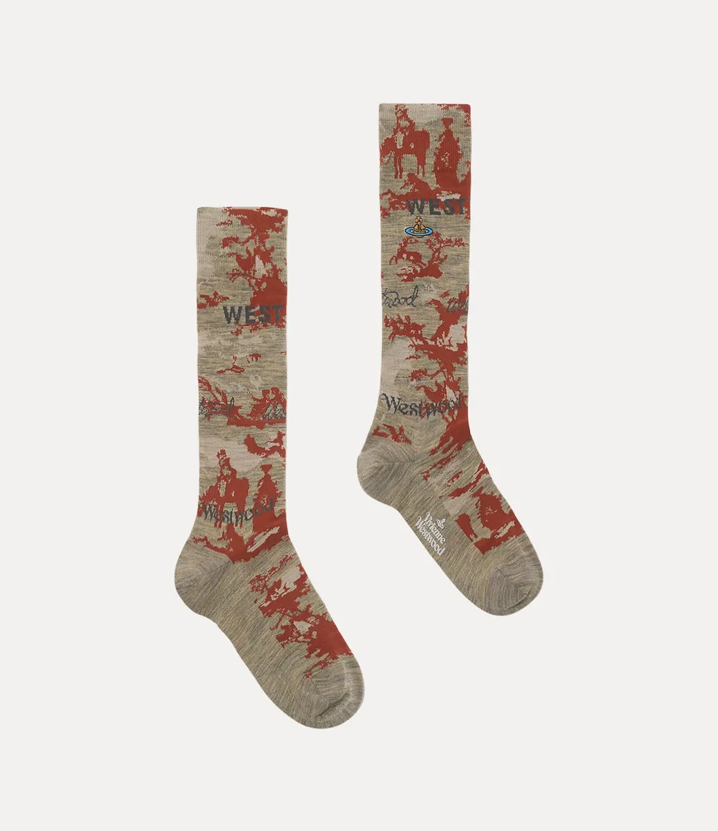 Ayak bileği uzunluğundaki çoraplarımız, romantik bir pastoral motif sunan Toile de Jouy jakar ile örülmüştür. Çift, ekstra ince merinos yünü karışımından üretilmiş ve çok renkli iplikle işlenmiş markanın orb motifiyle tamamlanmıştır.