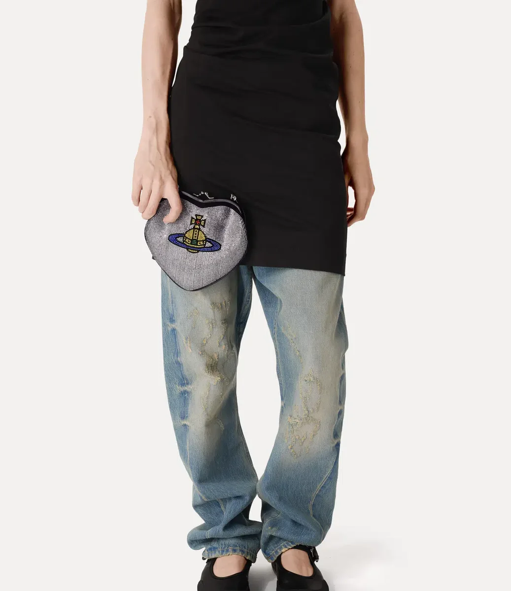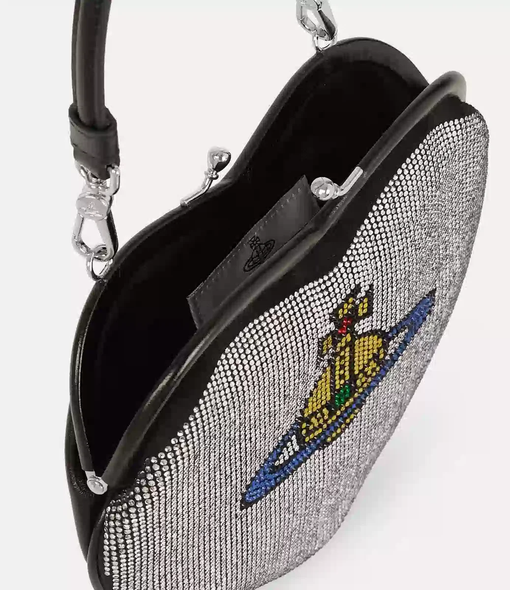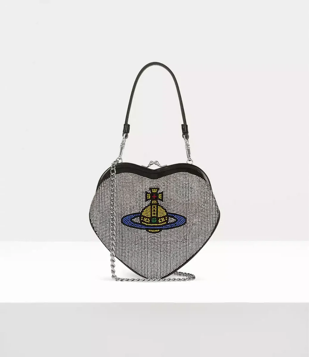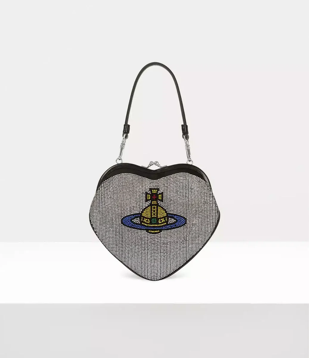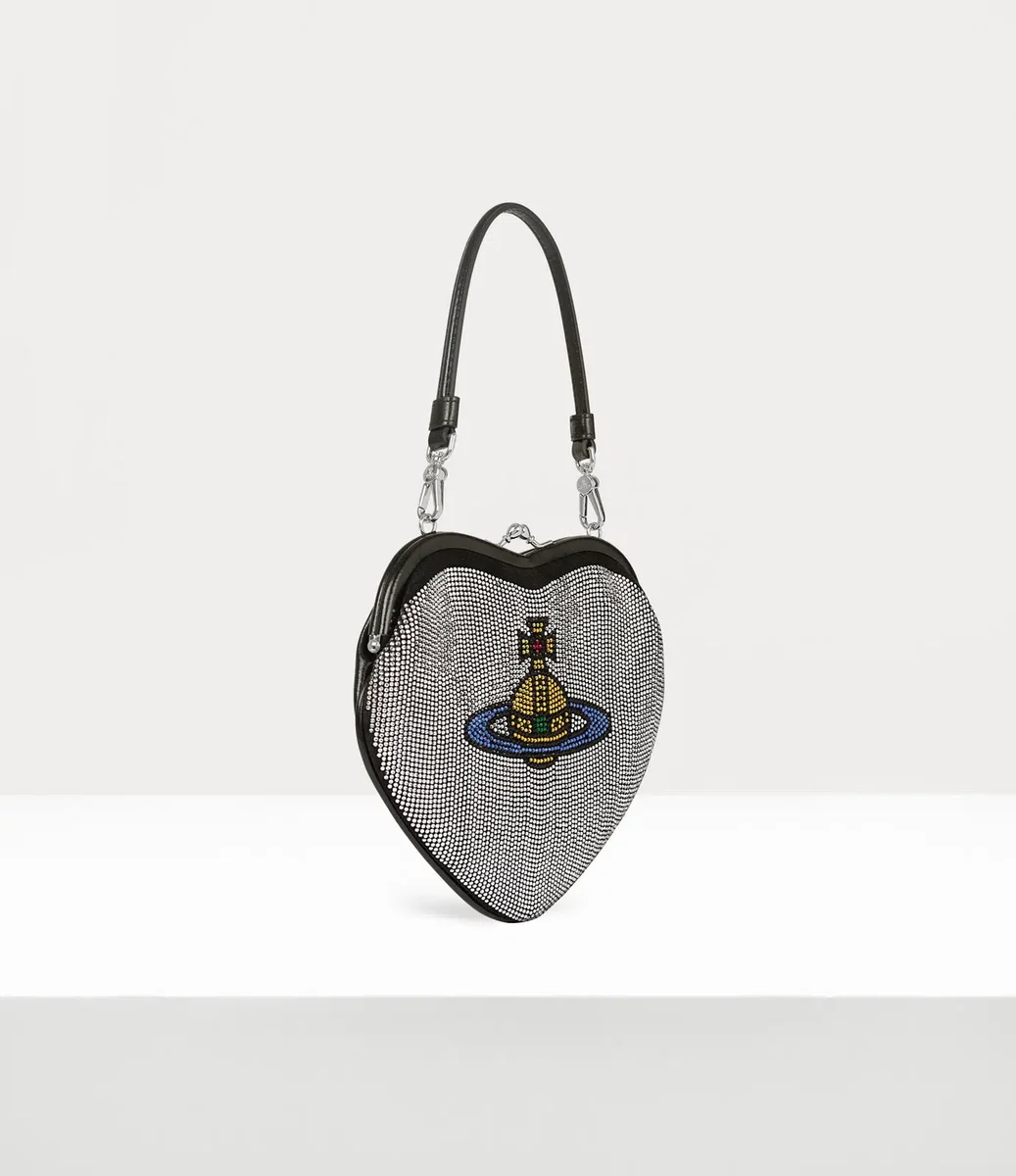 Vivienne Westwood Belle Heart Frame cüzdan, parıldayan elmas taşlarla süslenmiş kalp şeklinde bir siluete sahiptir.
