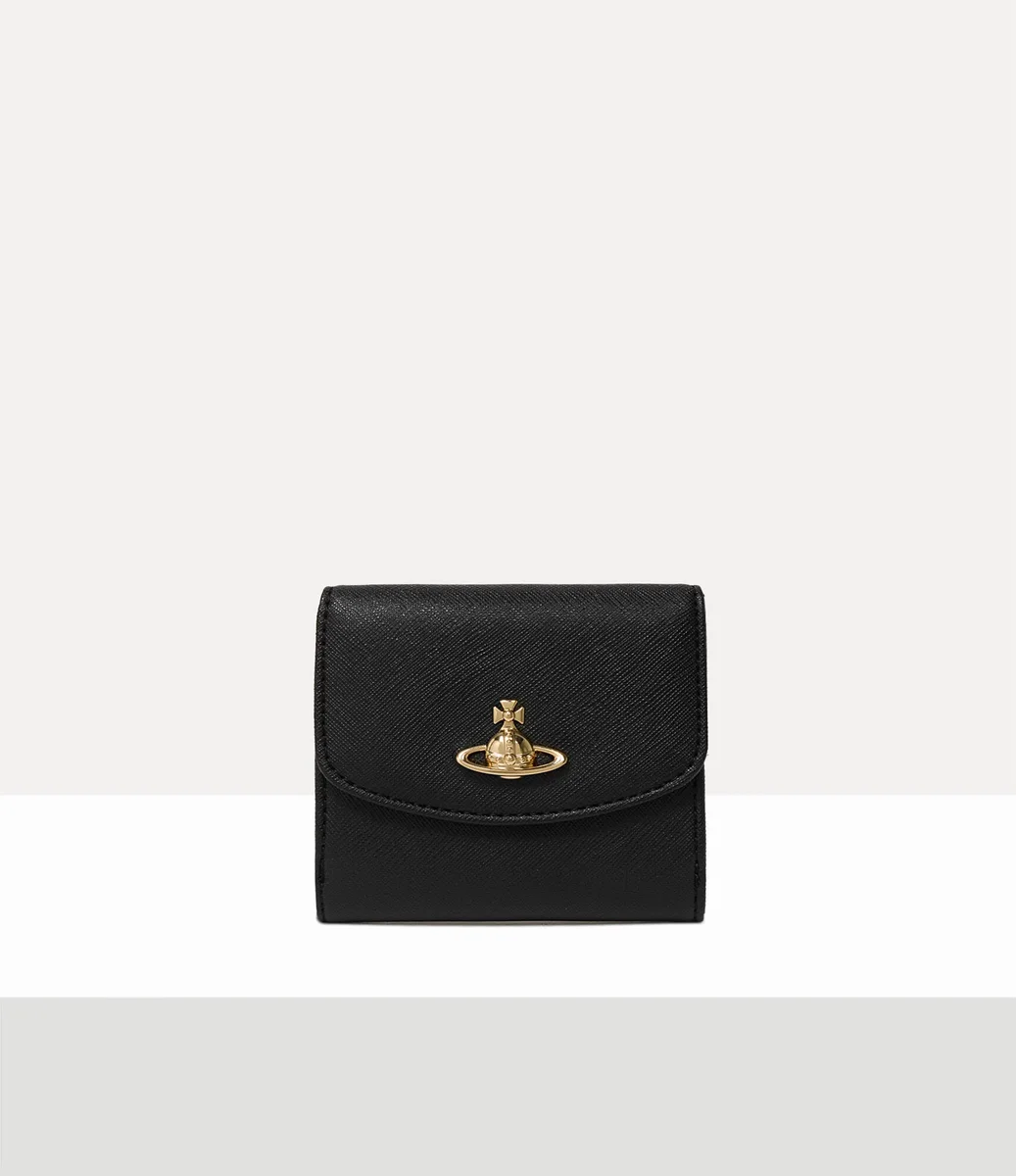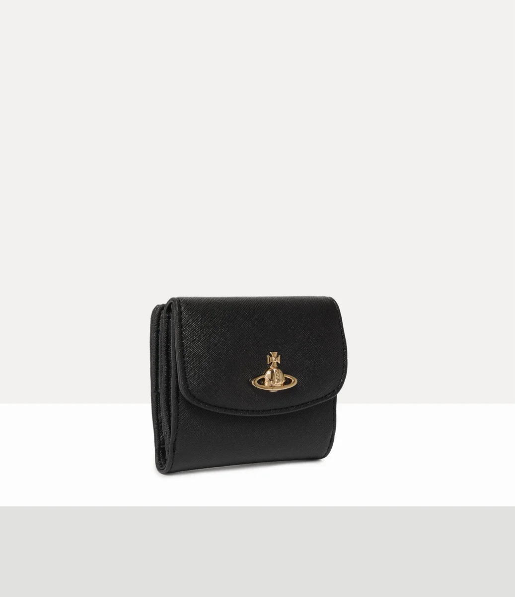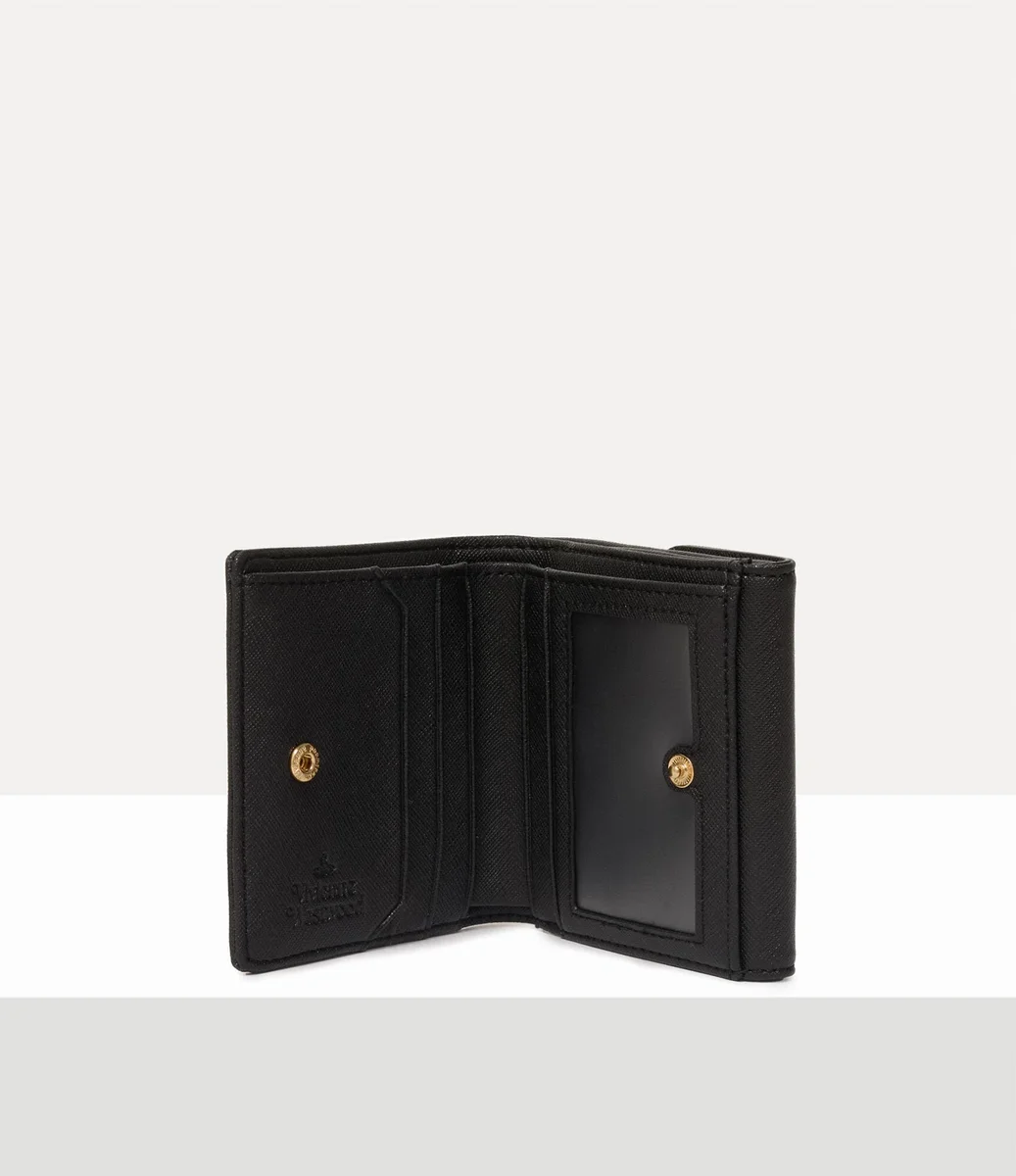 Küçük cüzdanımız, PU deriden üretilmiş, çapraz çizgili saffiano dokusuyla öne çıkan şık bir çift katlı tasarıma sahiptir. Markanın ikonik altın rengi metal orb logosu, cilalı çıtçıtlı kapak üzerinde yer alırken, iç panelde ise ince kabartmalı marka logosu bulunur.