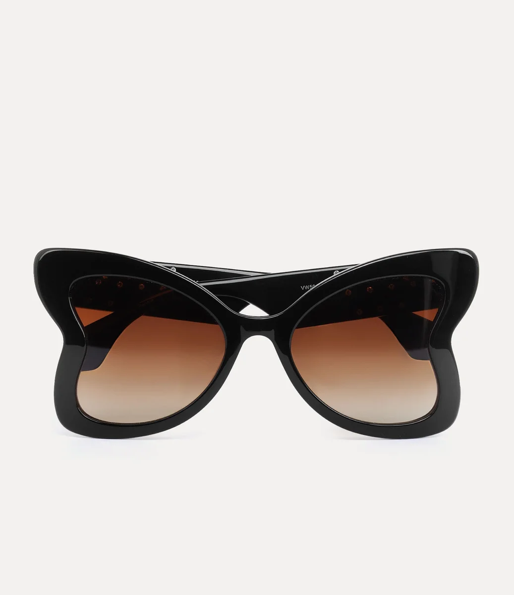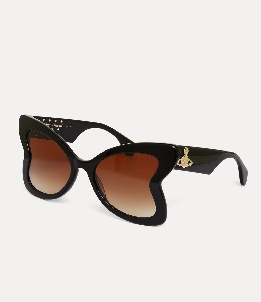 Kelebeklerden ilham alan büyük çerçeveli, el yapımı Athalia güneş gözlüklerimiz, kristal süslemeli iç kısım ve kademeli camlara sahiptir. Gürcü mücevher madalyonlarının güzelliğinden ilham alan saplar, altın rengi kürelerle süslenmiştir.