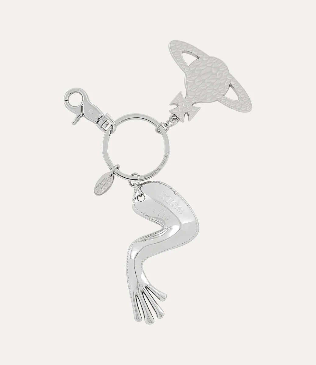 Cilalı gümüş kaplamadan üretilen Frog Leg Charm anahtarlığımız, “kurbağayı öpme” masal geleneğine eğlenceli bir gönderme yapar. Antik repoussé dekorundan ilham alan süslü bacak silueti, “Kiss me” sloganıyla oyulmuş ve markanın imzası olan “dövülmüş” efektli orb motifiyle tamamlanmıştır.