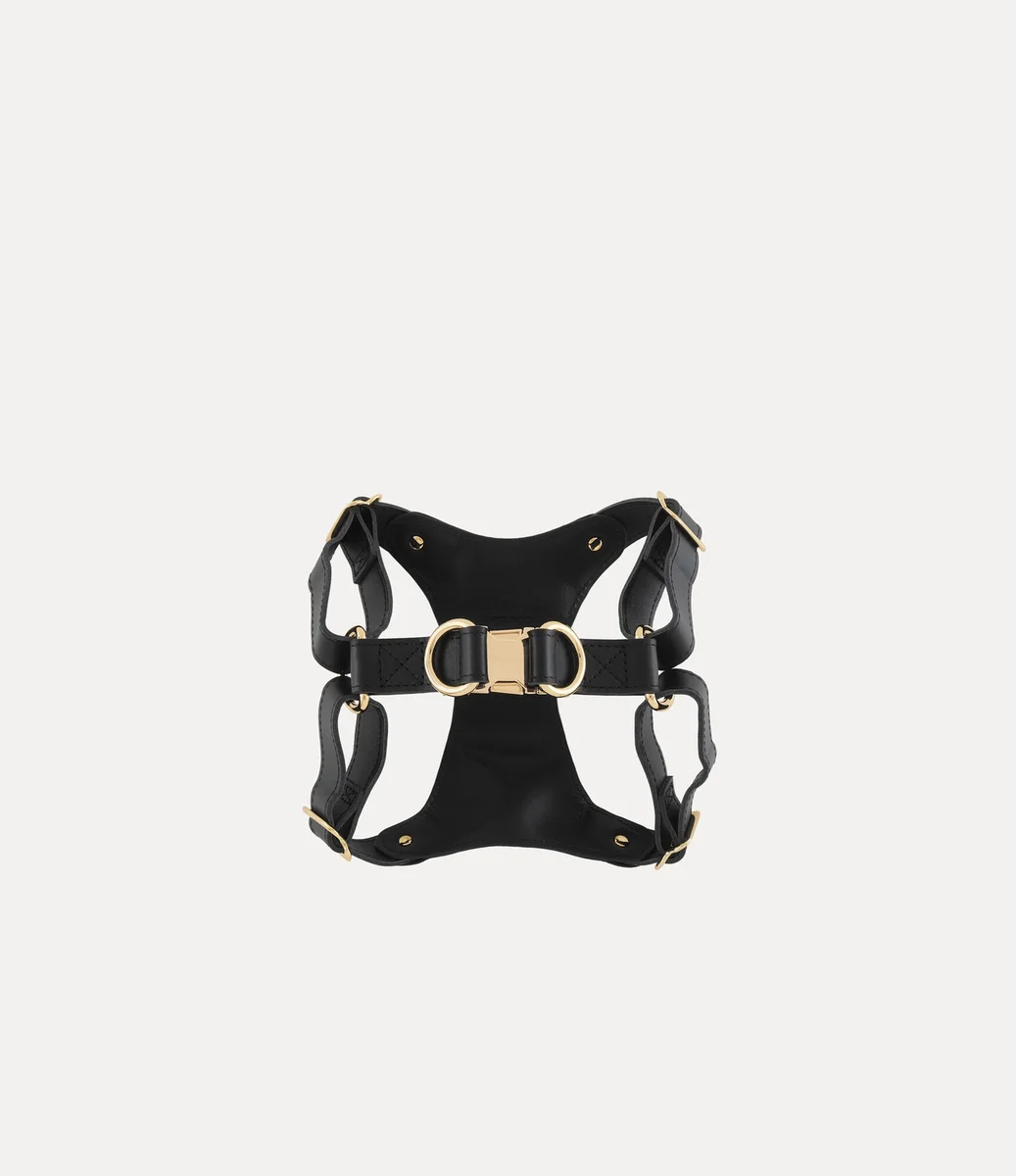 Markanın 2001 Sonbahar-Kış Gold Label koleksiyonundan “Vahşi Güzellik” adlı Steiff kumaşından esinlenilen köpek koşum takımı, cesur bir leopar motifine sahiptir. Heykelimsi göğüs plakası ve ayarlanabilir siyah kayışlarla tasarlanan bu parça, cilalı altın rengi donanım ve ortasında markanın imzası olan küre amblemi ile tamamlanmıştır.