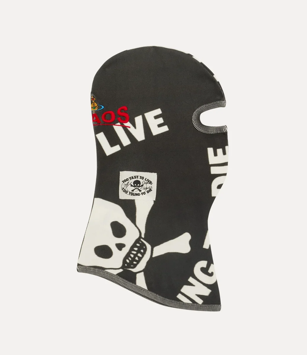 Worlds End Storm maskemiz, yumuşak, esnek örgü kumaştan üretilmiştir ve tam bir baş ve boyun örtümü ile rahat bir oturuş sağlar. Tasarım, Vivienne’in imzası olan Punk estetiğini çağrıştıran, cesur, tek renkli bir kurukafa ve çapraz kemik grafiği ile süslenmiştir.