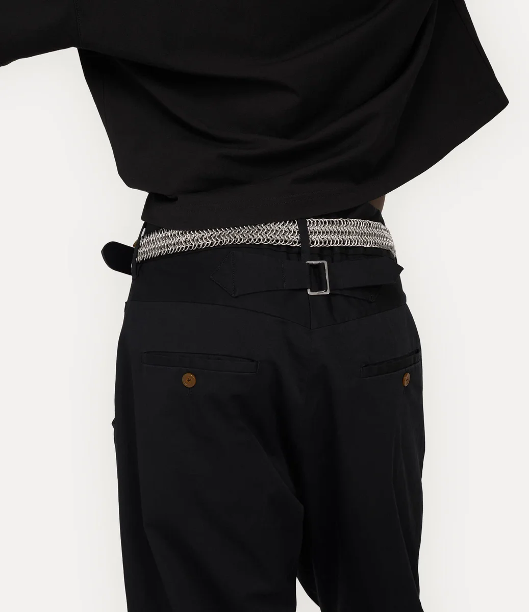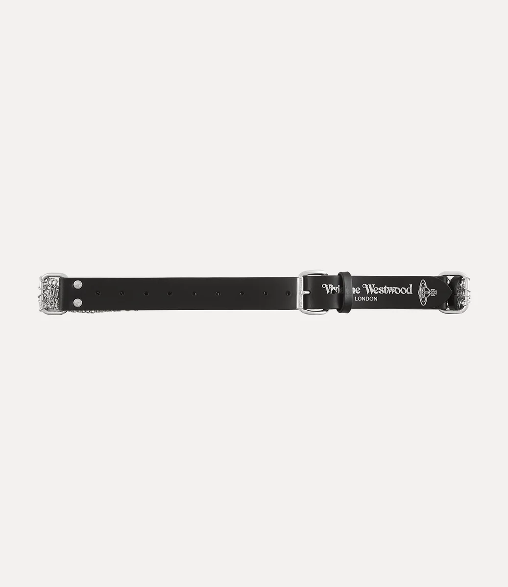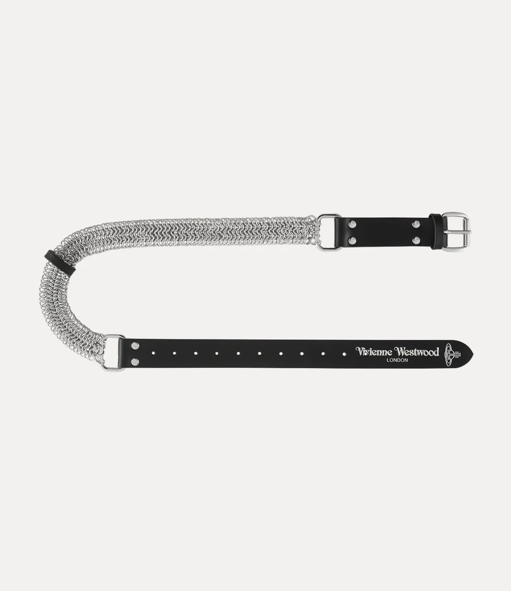 Zincir deri kemerimiz, markanın imza niteliğindeki Roller tokalı kemerin yeni bir versiyonudur. Geleneksel olarak vücudu korumak için tasarlanan eski zırhlardan esinlenerek cilalı gümüş zincir zırh parçaları içerir. Pürüzsüz deri profil, metalik folyo detaylarla zenginleştirilmiş imza niteliğindeki “Vivienne Westwood” harf motifiyle kabartılmıştır.