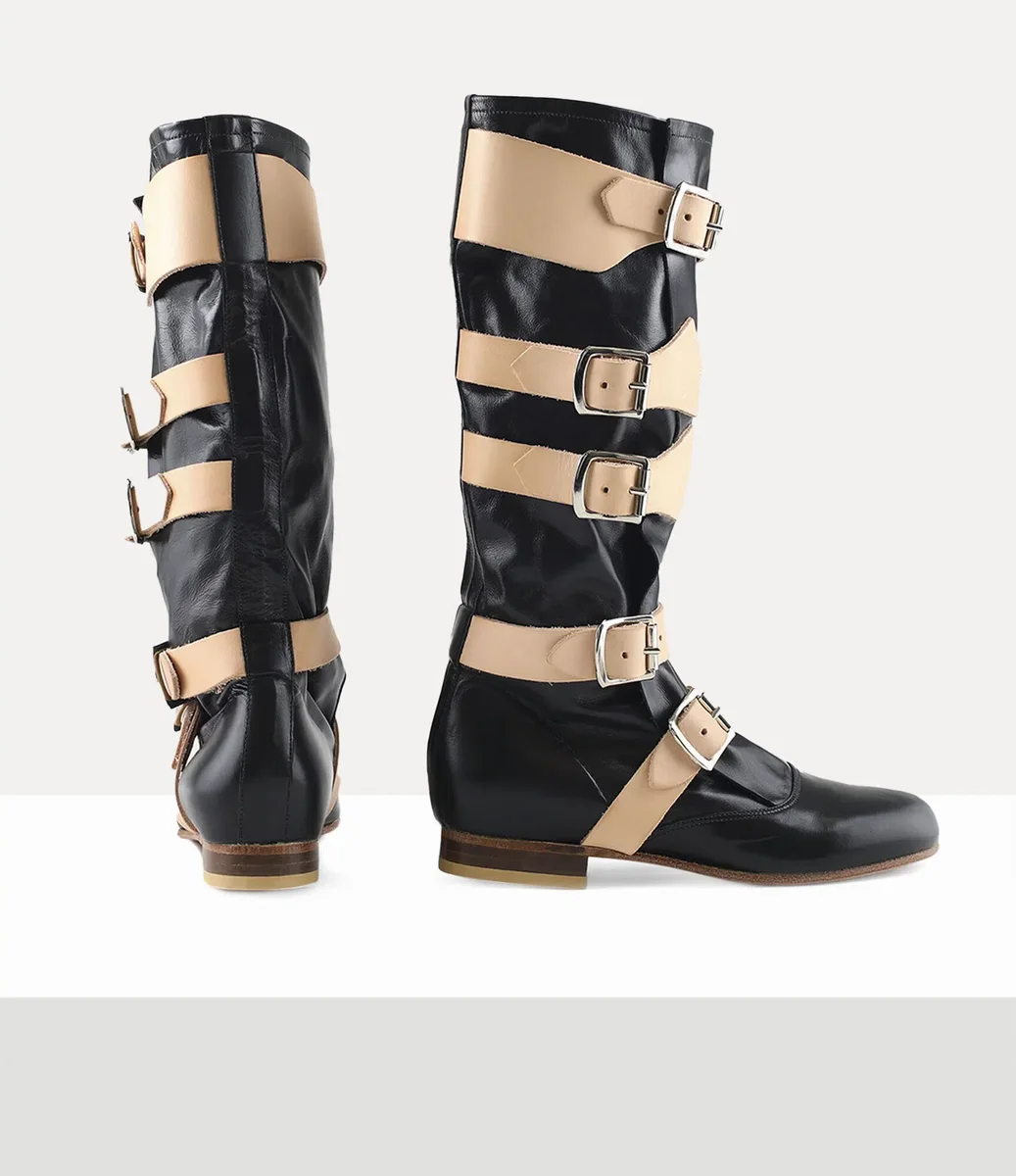 Korsan botlarımız ilk olarak 1981 Sonbahar-Kış “Korsan” koleksiyonunda tanıtıldı. Bu koleksiyon, Vivienne’in 17. ve 18. yüzyılların maceralı korsan hikayelerine olan ilgisinden etkilenerek tasarlandı. Tasarım, korsanlarla sık sık ilişkilendirilen romantizm ve isyanın özünü yansıtıyor. Sargılı, yumuşak, bol kesimli deri bacak ve ağır deri kayışlar, botlara sağlam ve eskitilmiş bir görünüm kazandıran makaralı tokalara sahiptir.