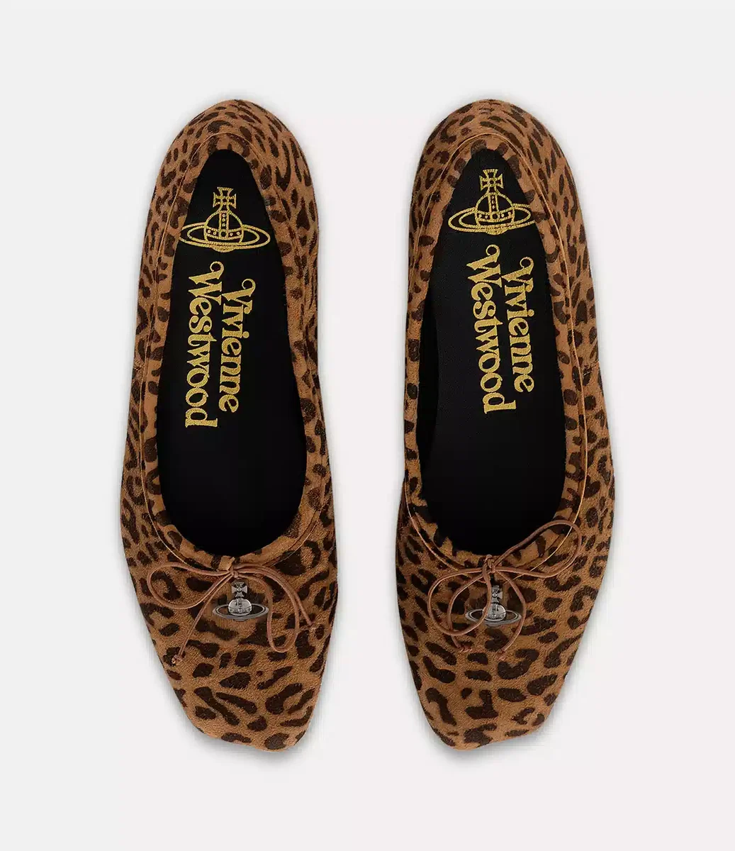 Vivienne Westwood Brigitte Ballerina ayakkabı, deriden üretilmiş olup anatomik bir siluete sahiptir ve vintage tarzı leopar desenli bir kaplamayla tamamlanmıştır.