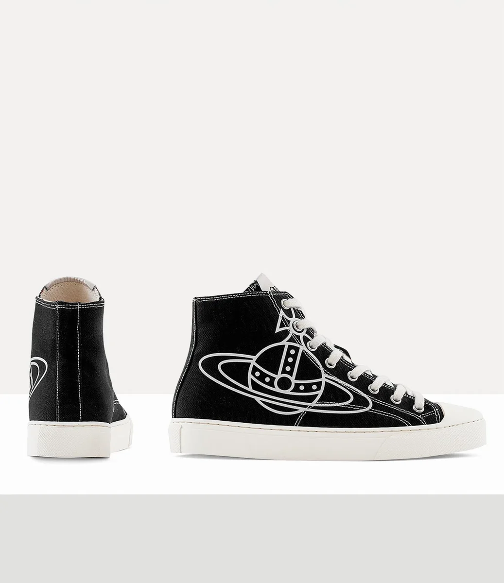 Yüksek bilekli kanvas plimsoll ayakkabılarımız, Vivienne’in geleneği geleceğe taşıma vizyonunun simgesi olan, markanın arşivinden alınan ‘Line Orb’ motifiyle tasarlanmıştır. Ayakkabı, pamuklu kanvas kaplamaya sahiptir ve dilinde dokuma etiketle süslenmiştir.