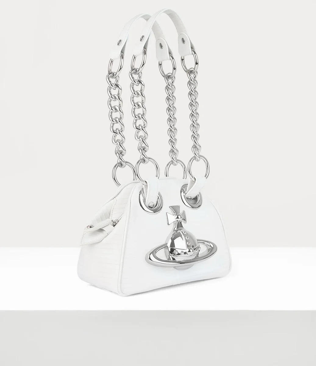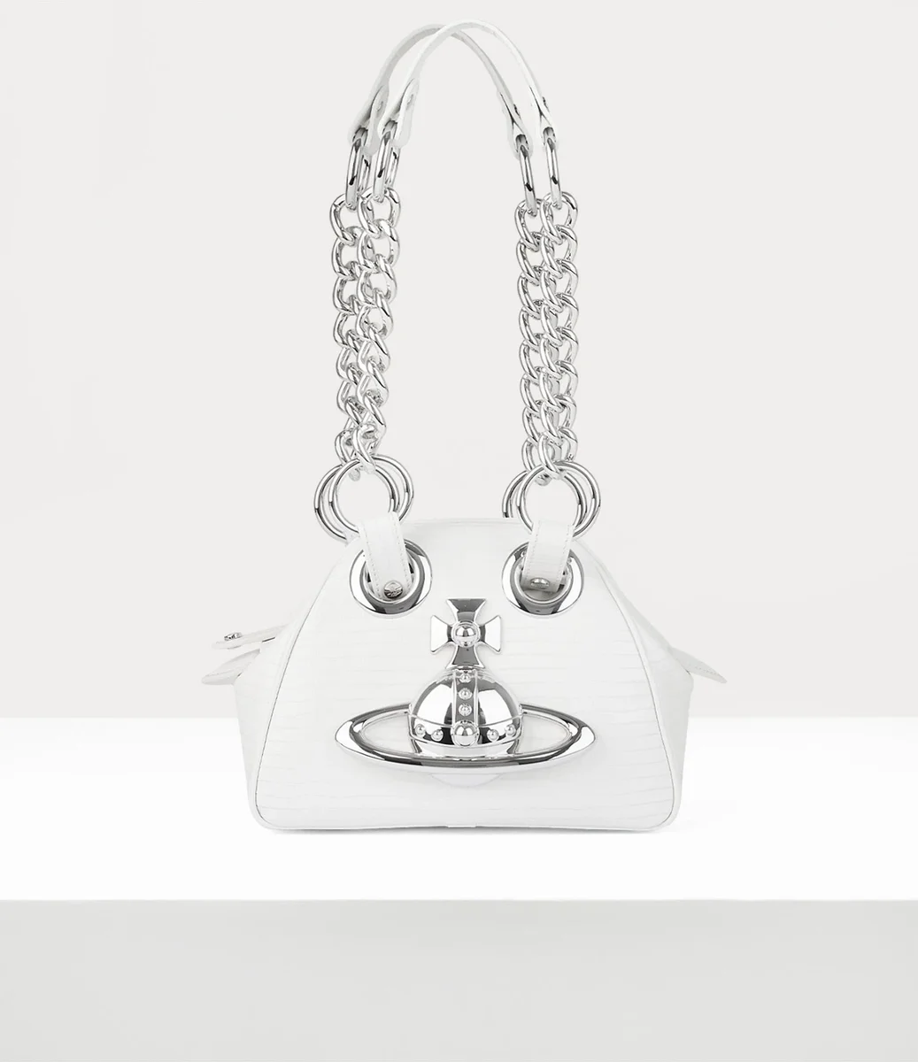 Vivienne Westwood’un 1991 İlkbahar-Yaz “Cut, Slash & Pull” koleksiyonunda ilk kez görücüye çıkan Archive Orb Chain çanta, bu sezon “Mini” timsah desenli kabartmalı deri ile yeniden tasarlandı. Çanta, ön panelinde büyük üç boyutlu küre motifine sahip olup, kayışları boyunca bondage esintili halkalar ve zincir detayları ile tamamlanıyor.