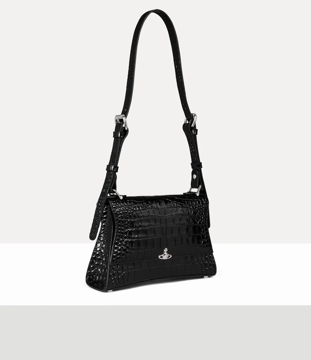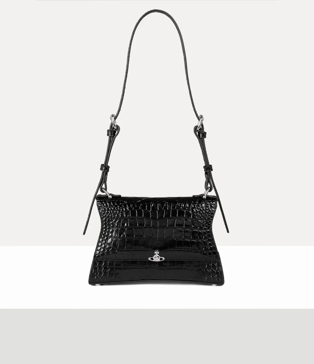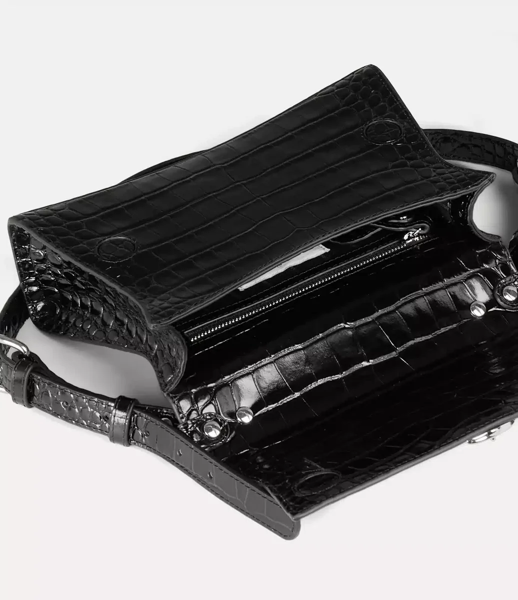 Bianca Küçük Omuz Çantası, 1950’lerin klasik siluetinden ilham alır ve markanın ikonik “Kelly” serisine ince bir gönderme yapan modern kıvrımlarla özenle yeniden yorumlanır. Deriden üretilen tasarım, ikonik Sex butiğimizde satılan sıvı lateks ve kauçuk giysileri anımsatan parlak patent dokulu timsah derisi efektli kabartma kaplamaya sahiptir.
