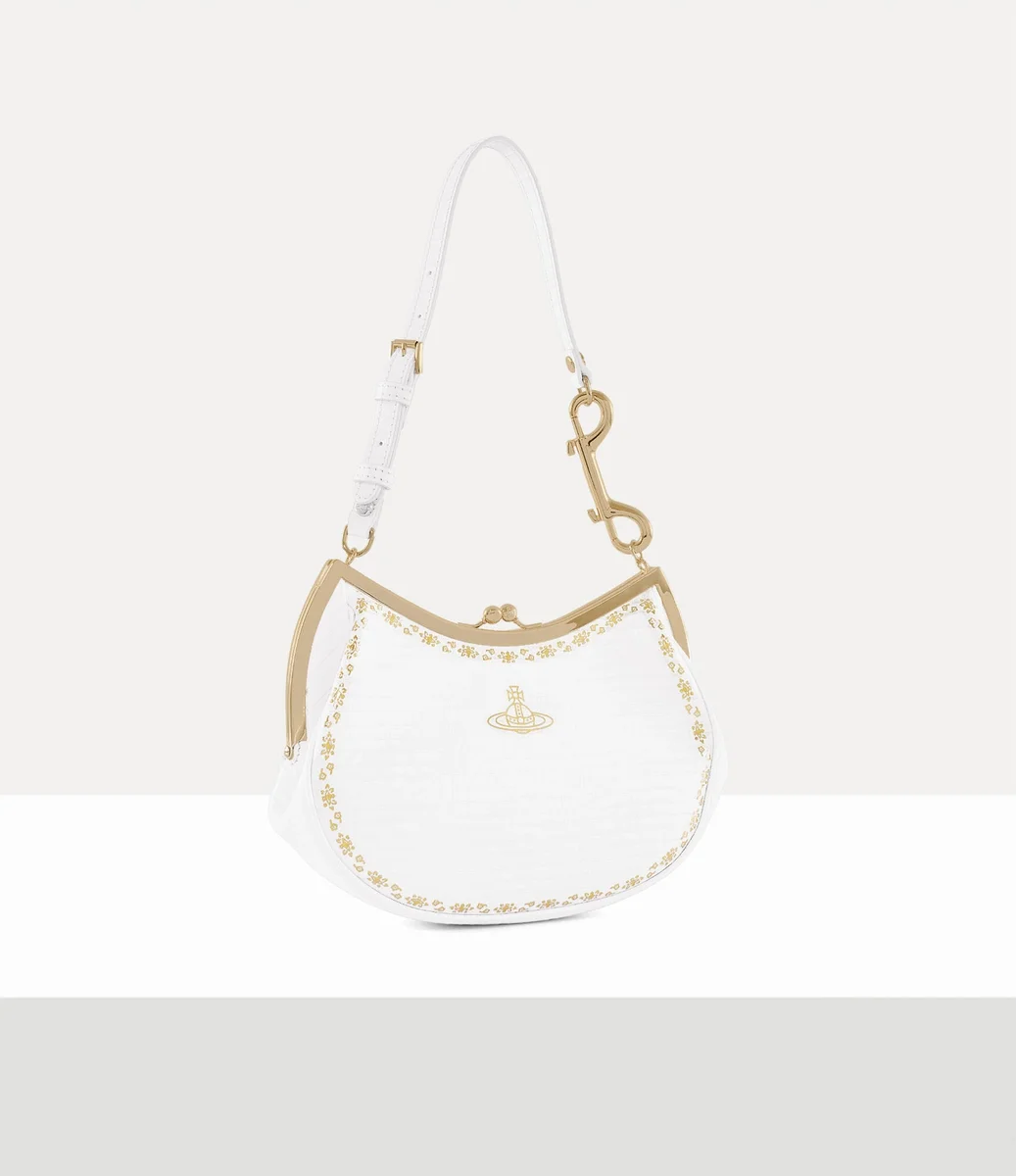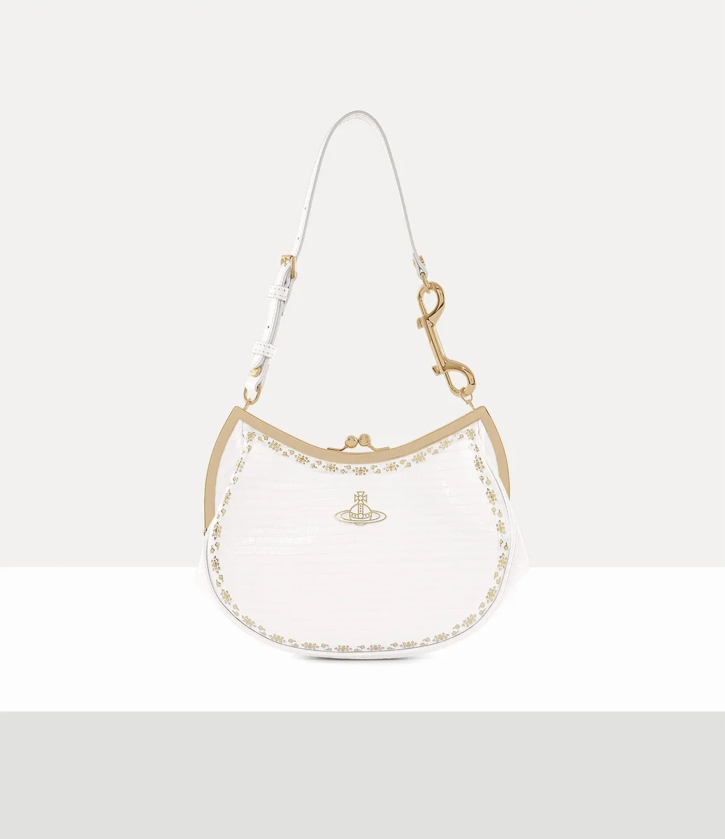 Charm Frame cüzdanımız, kayışında DIY esintili köpek klipsi detayıyla vurgulanmış hilal silueti ile dikkat çeker. İnce mini timsah efekti dokulu deriden üretilen bu parça, antika deri masa üstleri ve vintage mücevher kutularından ilham alan zarif altın varak kabartma ile tamamlanmıştır.