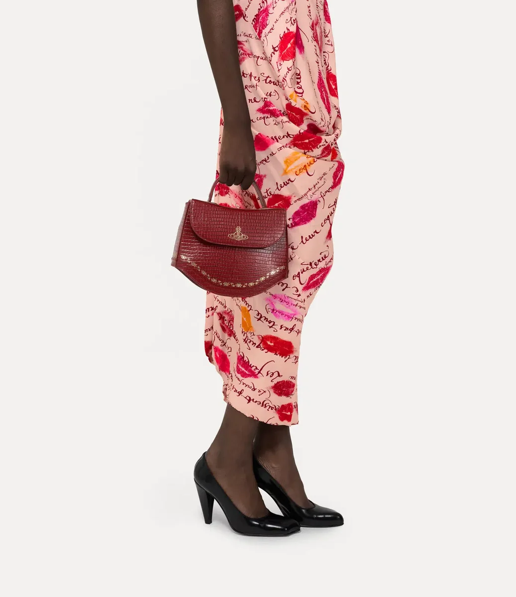 Vivienne Westwood Chloe Top Handle çanta, yumuşak dana derisinden üretilmiştir ve bu sezonun ‘Mini’ timsah derisi efektli kabartma motifine sahiptir.