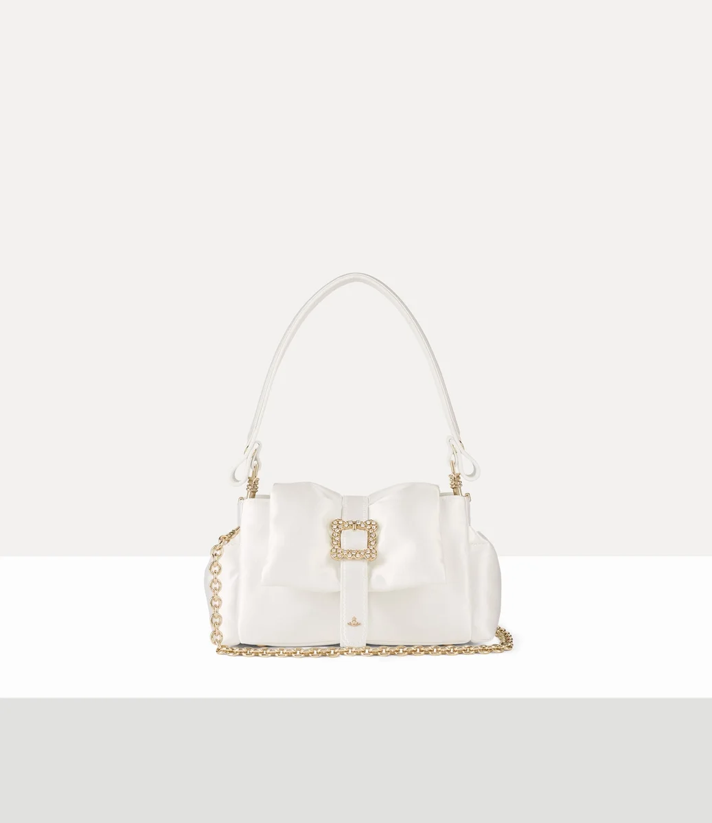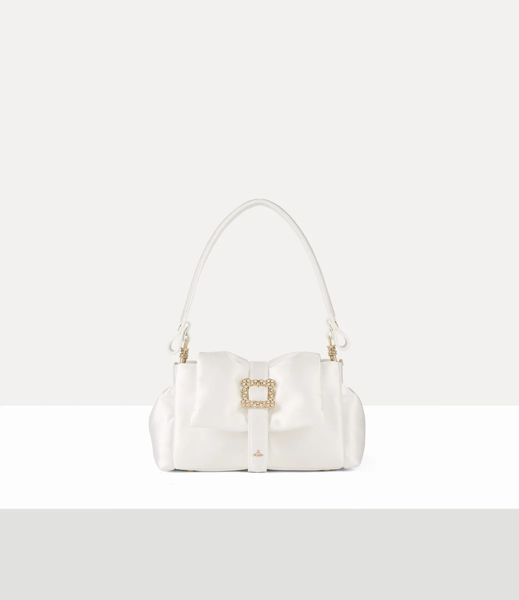 Hazel Mini Treasure el çantamız ipek karışımından üretilmiştir ve üst saplı bir tasarıma sahiptir. Çanta, markamızın imzası niteliğindeki pastel mavi astar ve cilalı metal detaylarla tamamlanmıştır. Yumuşak silueti saran heykelsi bir kemer kayışı, dekoratif bir küre charm ile süslenmiş ve Vivienne’in sanat tarihine olan saygısını yansıtan, kristal kaplı gösterişli bir çerçeve toka ile tamamlanmıştır.p>
