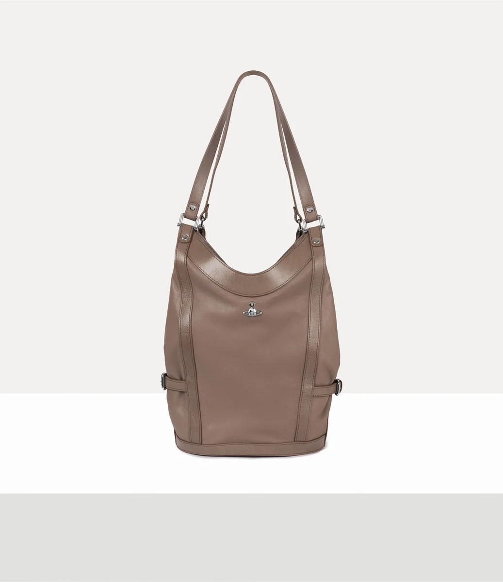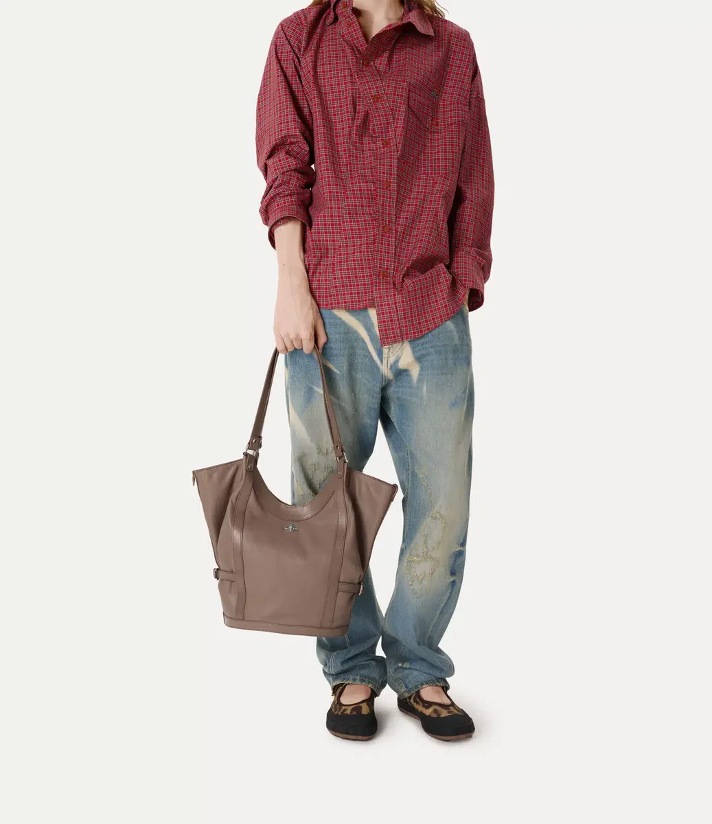 Olive Large Shoulder Bag, yumuşak deriden üretilmiş ve Vivienne’in Gold Label Sonbahar-Kış 2015 koleksiyonunda ilk kez tanıtılan imza niteliğindeki ‘Broken Pinstripe’ deseniyle astarlanmıştır. Yumuşak, gevşek bir siluete sahip olan bu parça, bir koşum takımı gibi şekli saran bondage tarzı kayışlarla detaylandırılmıştır.