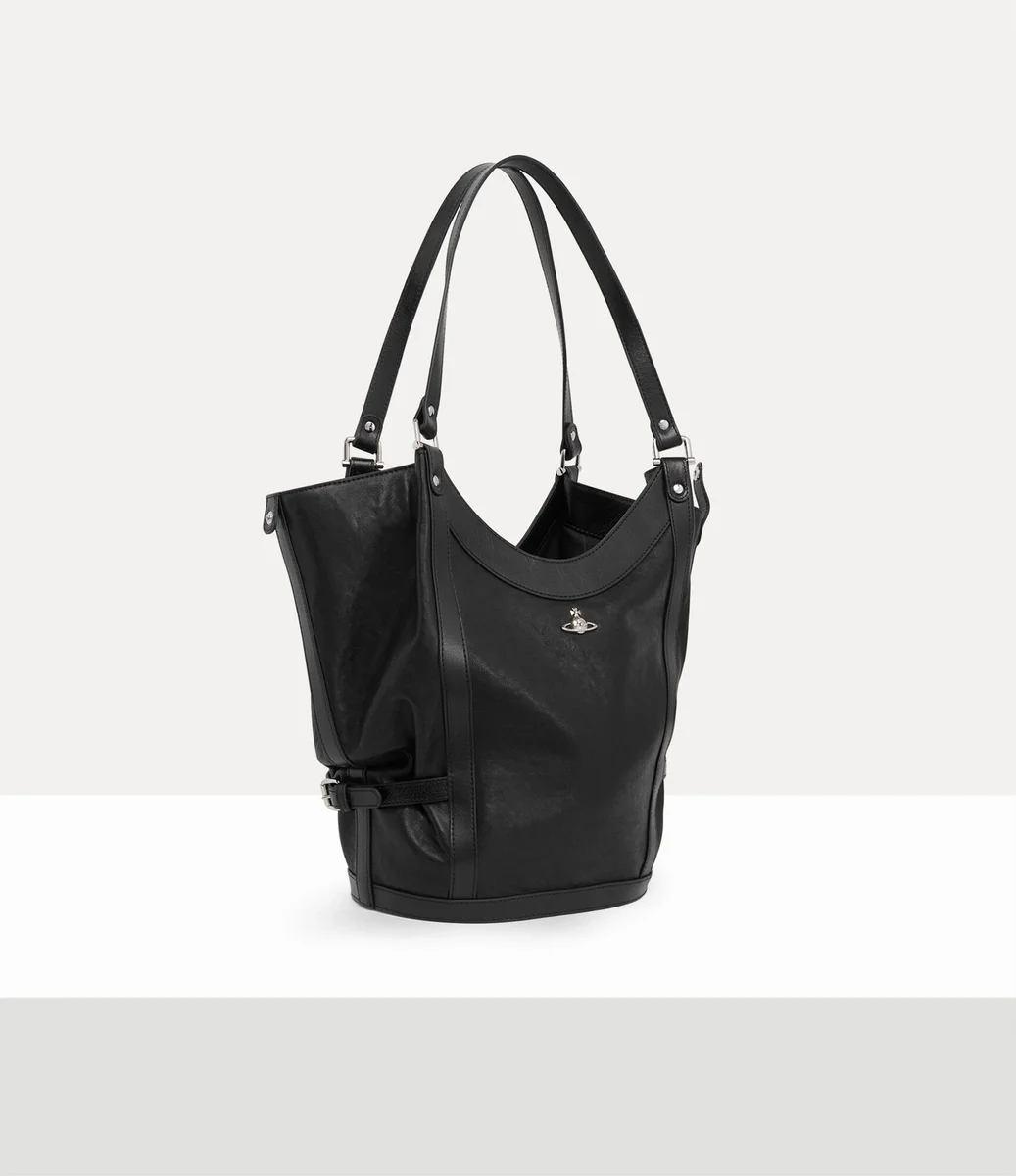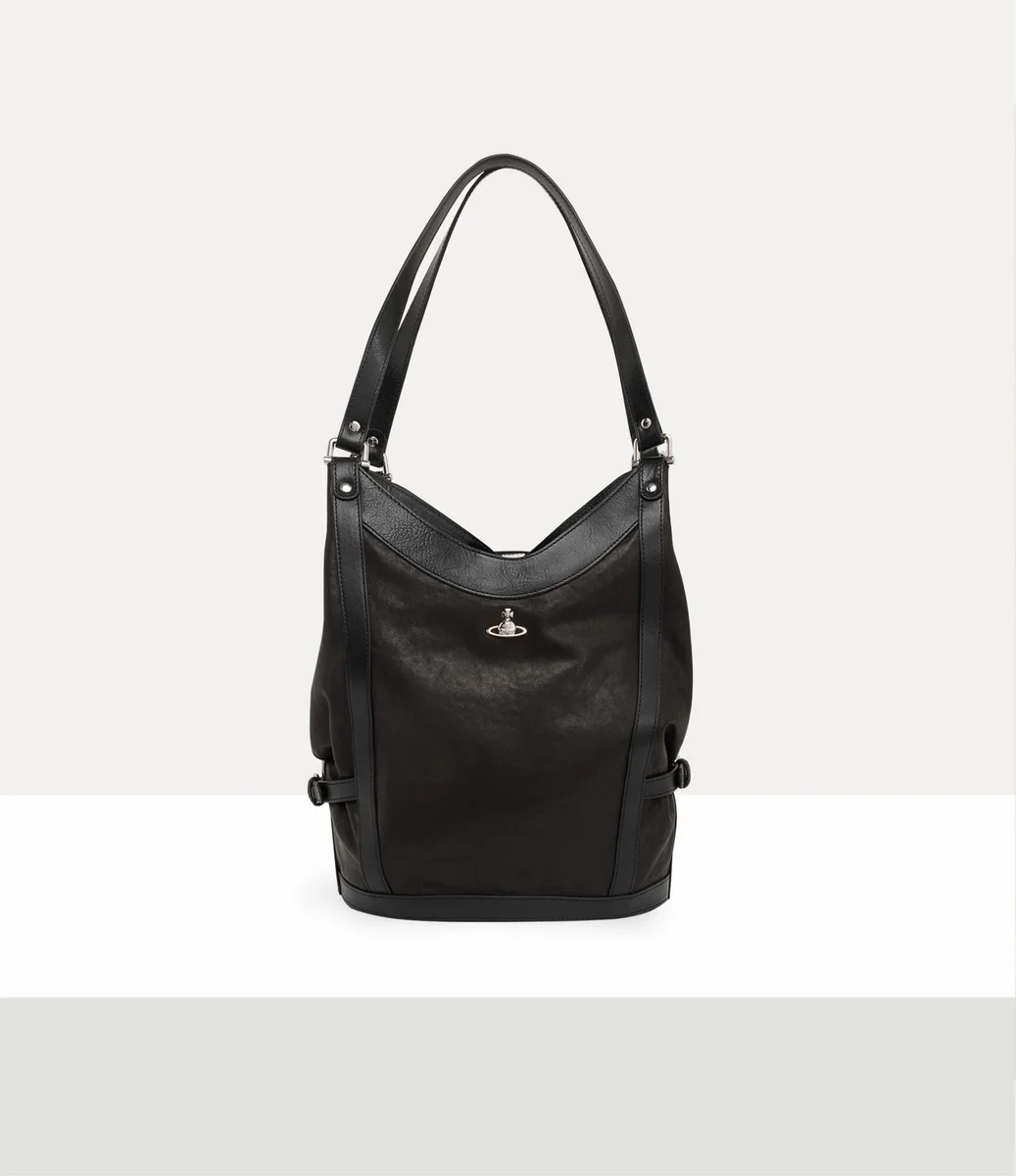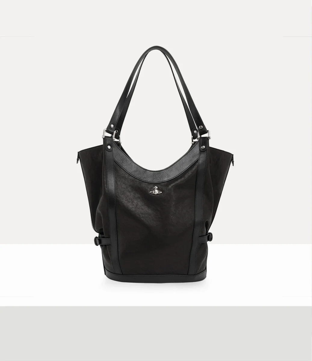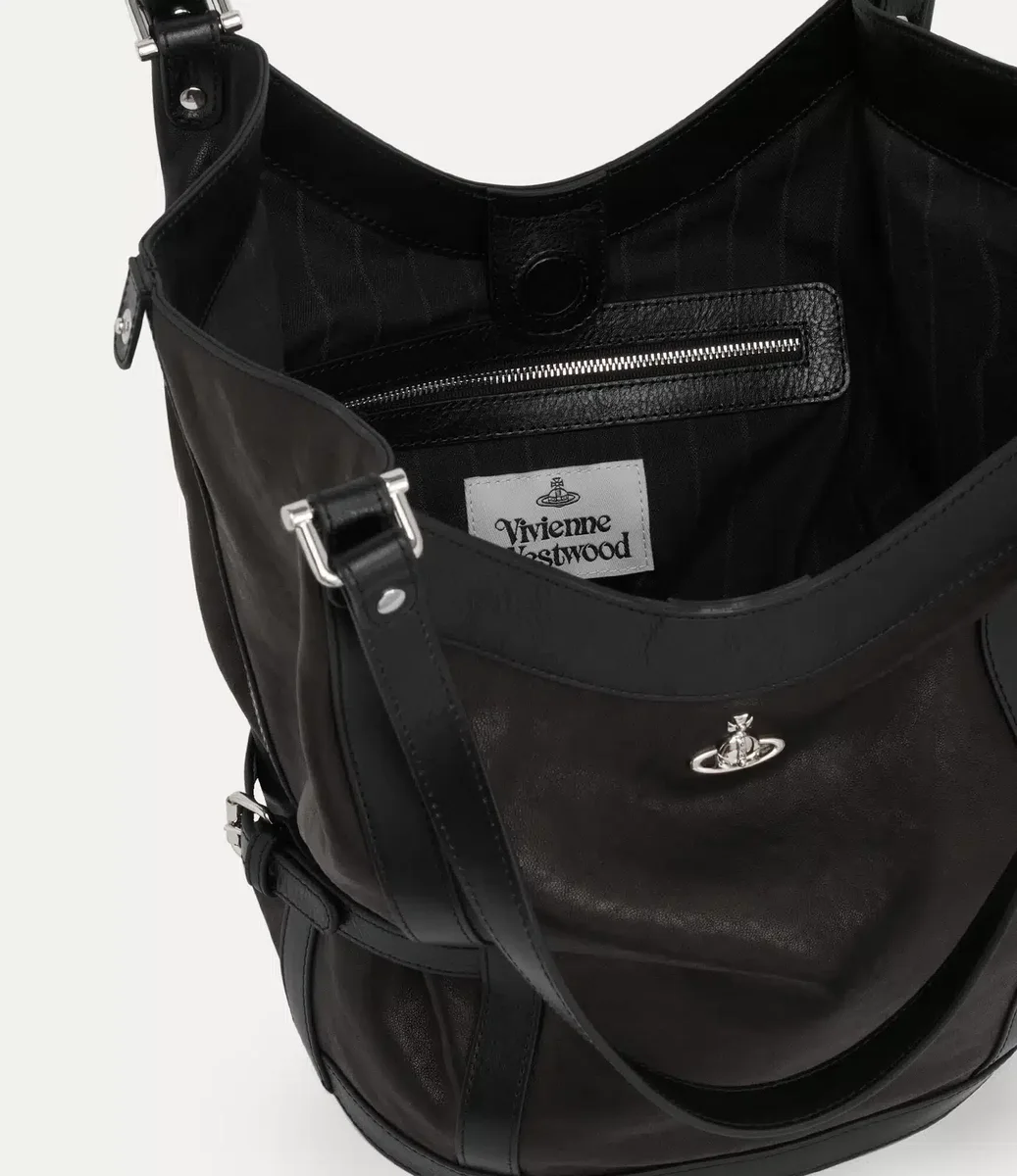 Olive Büyük Omuz Çantası, yumuşak deriden üretilmiş ve Vivienne’in Gold Label Sonbahar-Kış 2015 koleksiyonunda ilk kez tanıtılan imza niteliğindeki ‘Broken Pinstripe’ deseniyle astarlanmıştır. Yumuşak, gevşek bir siluete sahip olan bu parça, bir koşum takımı gibi şekli saran bondage tarzı kayışlarla detaylandırılmıştır.