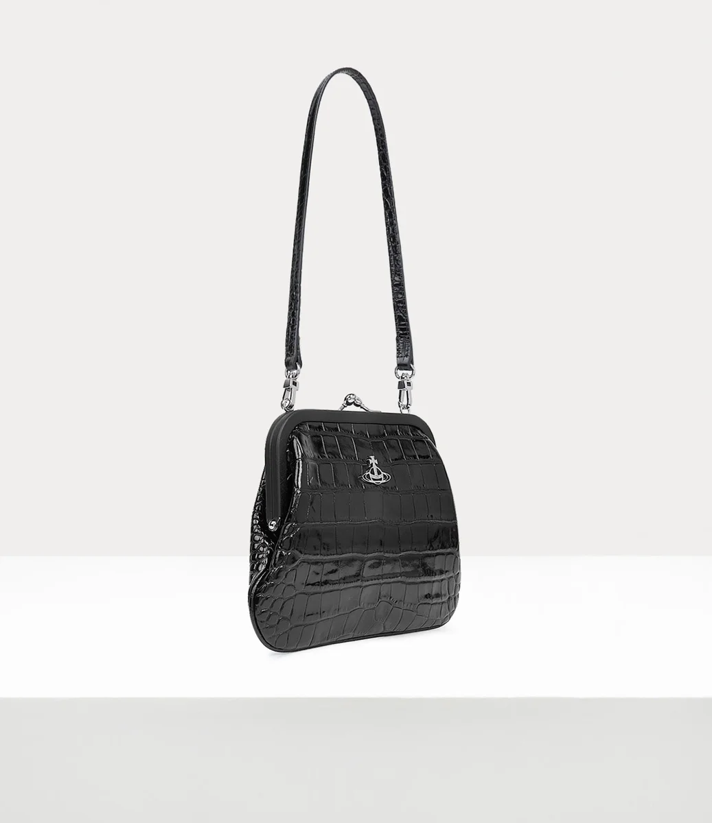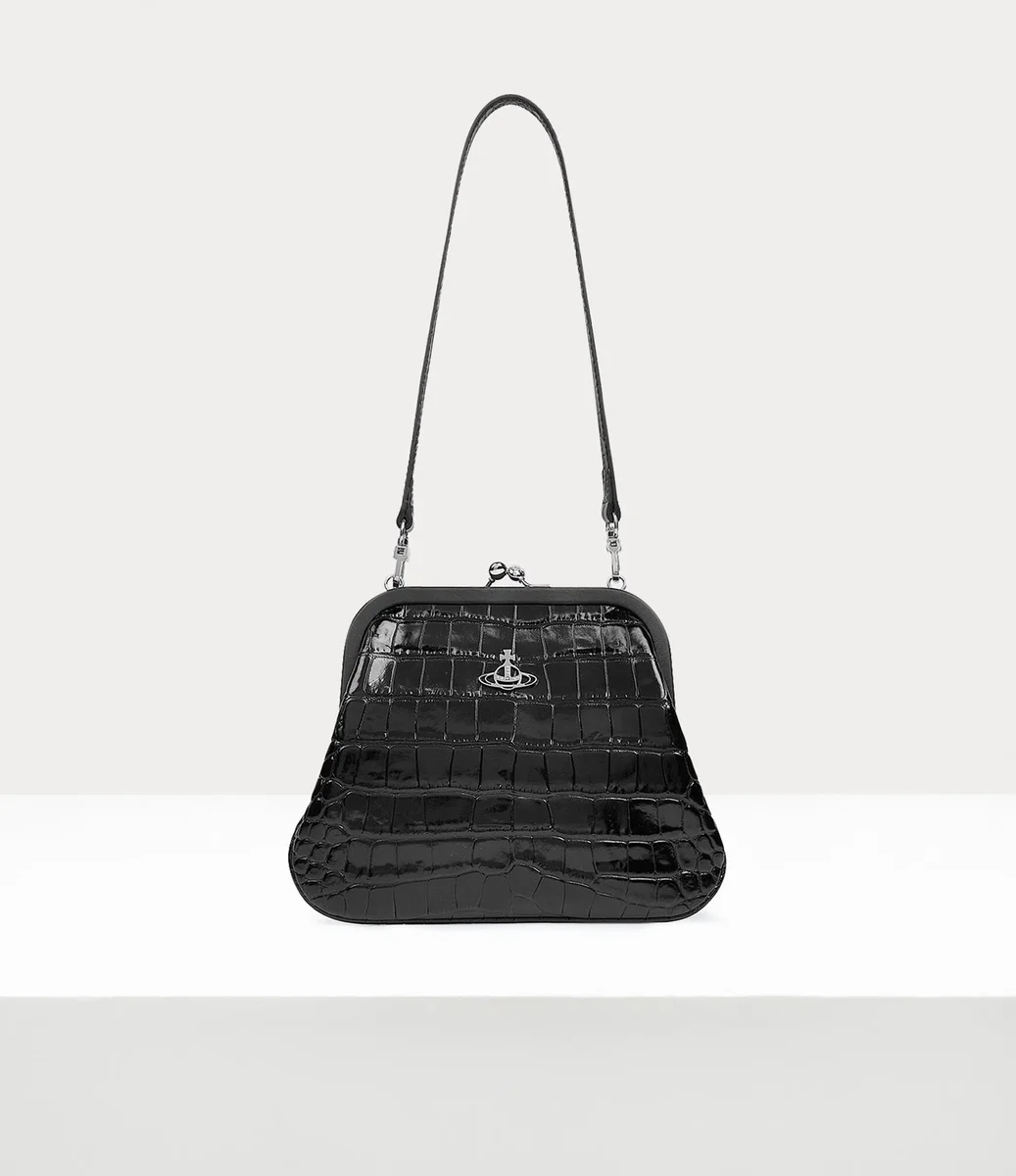 Vivienne’in clutch çantası, parlak deri kaplamalı, vintage esintili kiss-lock çerçeve ve krokodil desenli kabartma tasarımla sunulmaktadır. Bu parça, bu stili çok seven Vivienne’in adını almıştır ve ön panelinde markanın imzası olan ‘Line Orb’ motifi ile süslenmiştir.