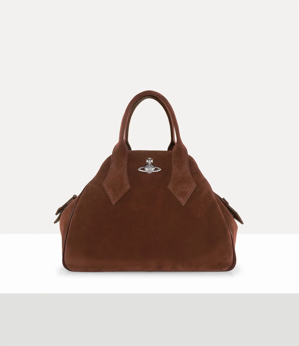 Yasmine Medium çantamız, esnek süet deriden yeniden tasarlanmış ve çift üst saplı bir siluete sahiptir. İç kısım, Vivienne Westwood Gold Label 2015 Sonbahar-Kış koleksiyonunda ilk kez tanıtılan klasik çizgili desenin yeniden yorumlanması olan, markanın imzası niteliğindeki “Broken Pinstripe” motifiyle kaplanmıştır.