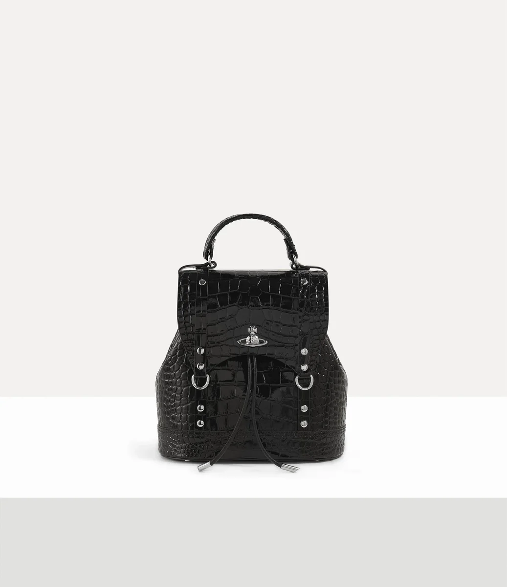 İmzamız olan Max Small sırt çantası, ikonik Sex butiğimizde satılan sıvı lateks ve kauçuk giysileri anımsatan, patentli dokuya sahip timsah desenli kabartmalı deri kaplamayla sunuluyor. Bu parça, 1995 İlkbahar-Yaz koleksiyonumuzdaki “Erotic Zones” koleksiyonunu anımsatan, bondajdan ilham alan unsurlar içeriyor.