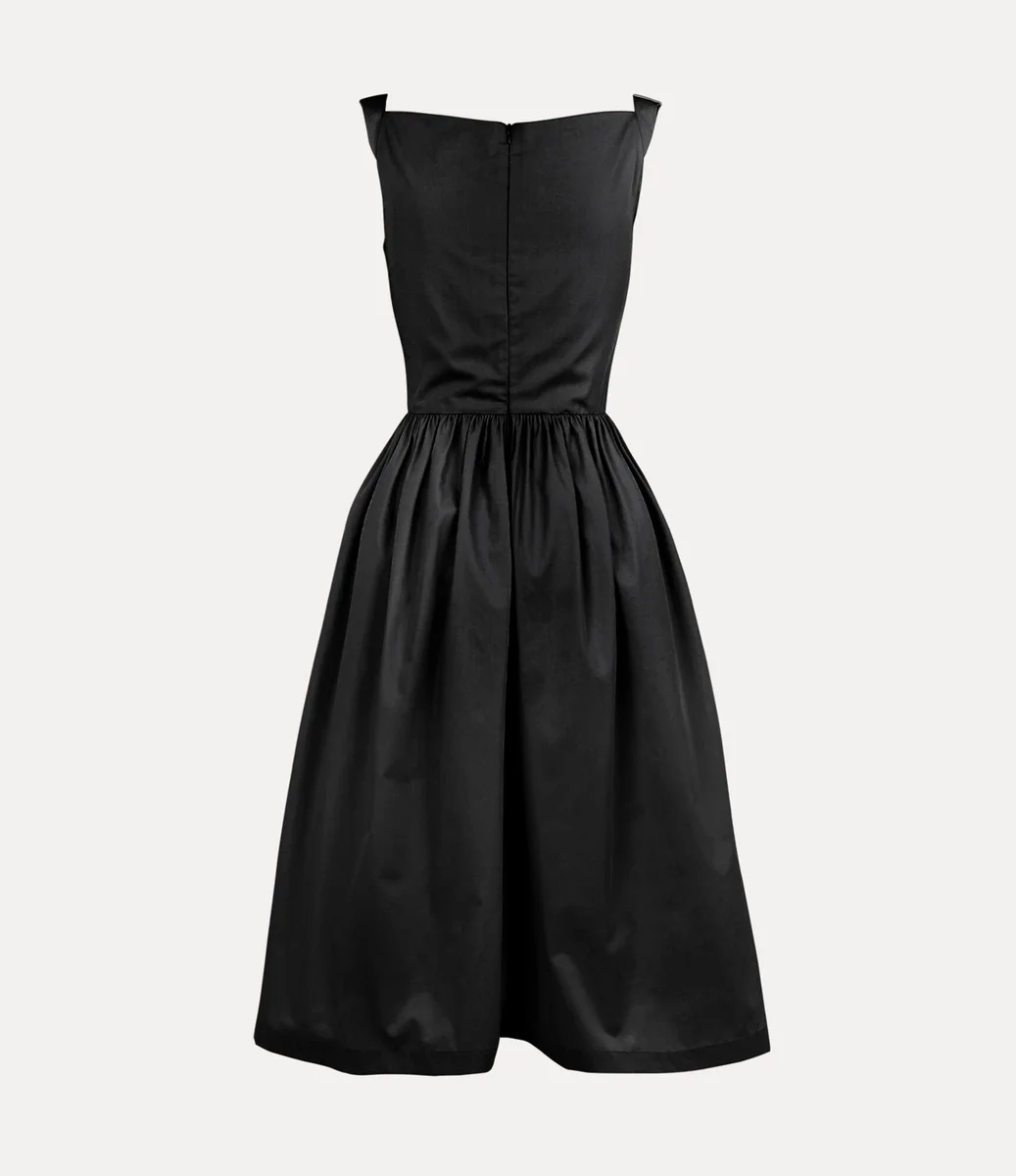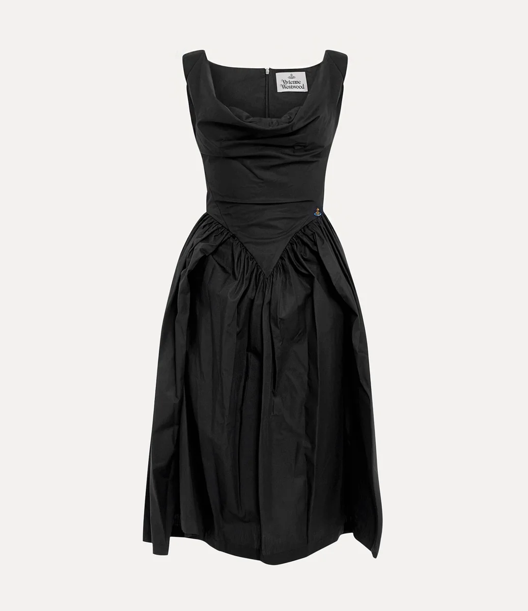 Pazar elbisemiz, ilk olarak Vivienne Westwood’un 1997 İlkbahar-Yaz ‘Vive La Bagatelle’ koleksiyonunda görücüye çıkan bu sezon yeniden canlandırıldı. 18. yüzyıl salon kültürünün yüksek sosyete kadınlarından ilham alan bu parça, midi uzunlukta, korseden esinlenen bir siluete sahiptir ve kalçaya işlemeli küre detayıyla tamamlanmaktadır.
