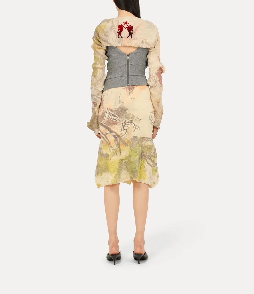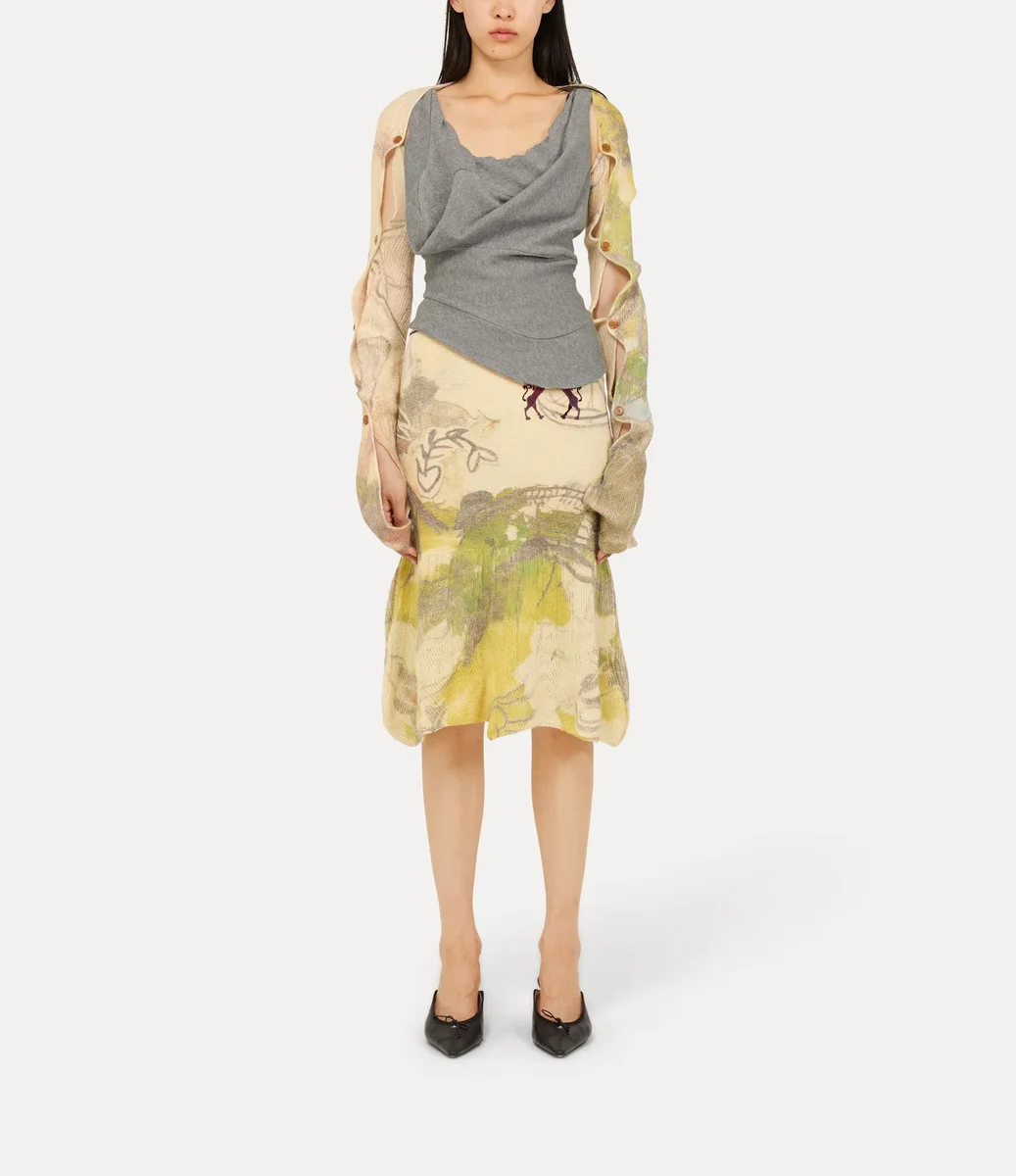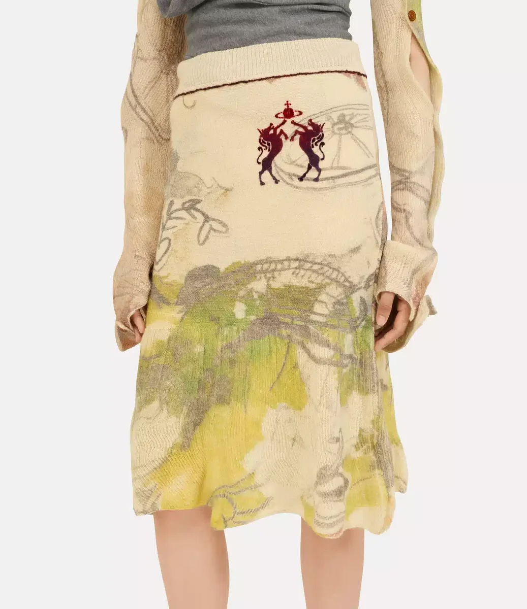 Kyle eteğimiz yumuşak yünden üretilmiş ve tamamı ribana örgü ile örülmüştür. Sanatçı Dominic Myatt’ın bu sezonun “Paradise” adlı eserinden esinlenerek basılmış olan tasarım, ironik bir ütopya vizyonunda çöp ile kaplı bir dünyayı tasvir ederken, kalça kısmında kırmızı ve mavi ombré efektli “Horses with Orb” motifiyle süslenmiştir.