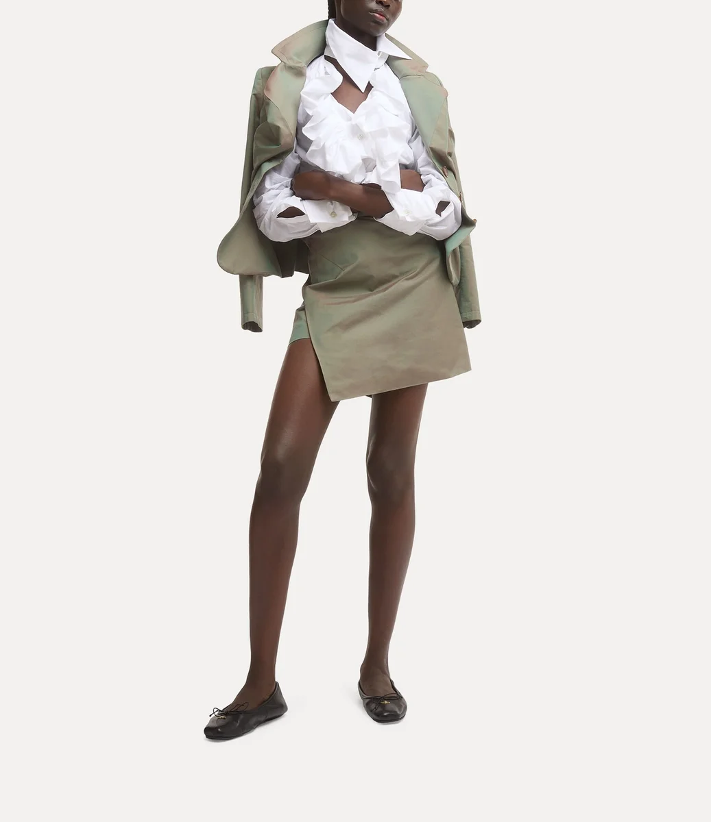 Mini Infinity eteğimiz, kalçaları zarif bir şekilde saran pamuk karışımından üretilmiştir ve asimetrik bir kaplamaya sahip, şık ve yapısal bir A-line siluet oluşturan orta yükseklikte bir bel bandına sahiptir. Tasarım, gizli bir fermuar ve kehribar tonlu bir düğme ile sabitlenir ve tümü yıkanmış adaçayı yeşili tonundadır.