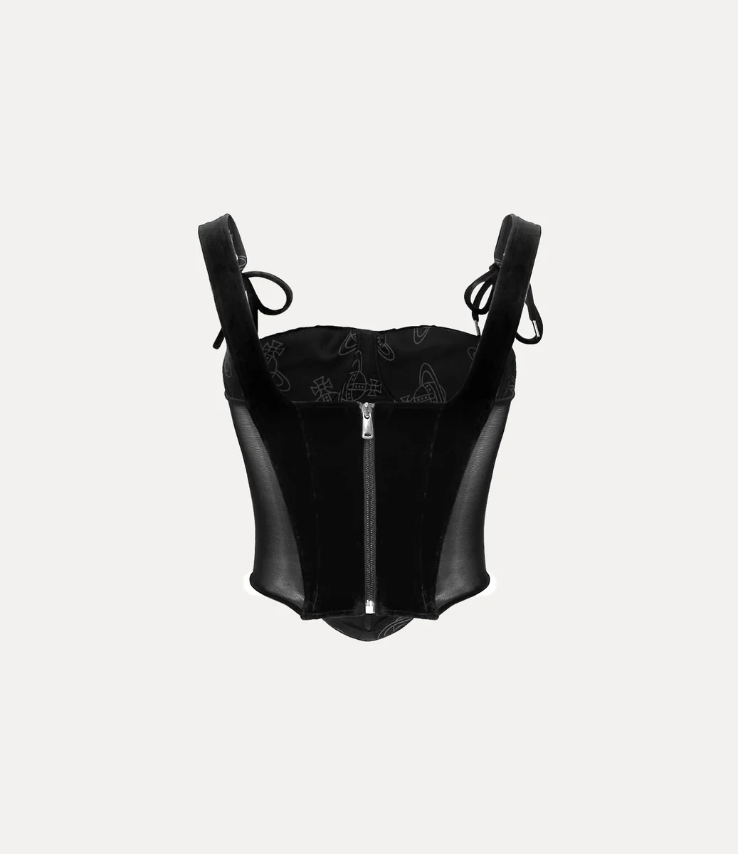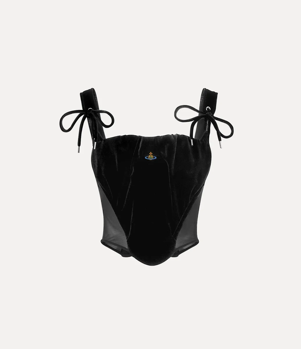 Bu sezon siyah kadife renginde üretilen Puppy korse, klasik bir Vivienne Westwood parçasıdır ve 18. yüzyılın tarihi korselerinden esinlenerek tasarlanmış, bel kısmı sıkı ve hafif kavisli kare yakalı bir modeldir. Tasarım, Vivienne’in geleneği geleceğe taşıma vizyonunu yansıtan üç boyutlu küre fermuar ile tamamlanmıştır.