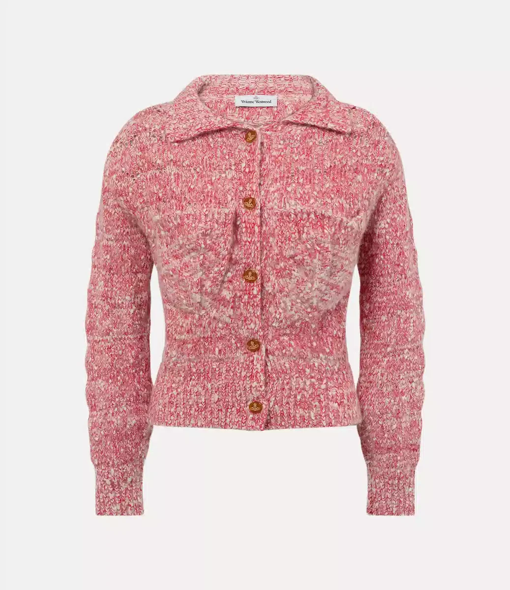Arianna hırkamız, kalın pamuk ve alpaka yünü karışımı örgüden üretilmiştir ve pembe-beyaz melanj kaplamaya sahiptir. Bel kısmı belirgin, dar kesimli bir siluete sahip olan bu parça, sivri yakalı, nervürlü kenarlı ve ön kısmında markanın imzası olan oval küre düğmelerle detaylandırılmıştır.