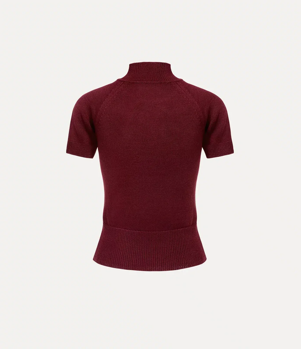 Bea balıkçı yaka üstümüz yumuşak yünden üretilmiştir ve orta yükseklikteki yakası, hafifçe kısaltılmış etek ucuna doğru akıcı bir şekilde uzanır. Kısa raglan kollu ve nervürlü kenarlı bu parça, göğüs kısmında Vivienne’in geleneği geleceğe taşıma vizyonunun simgesi olan çok renkli işlemeli bir küre ile tamamlanmıştır.