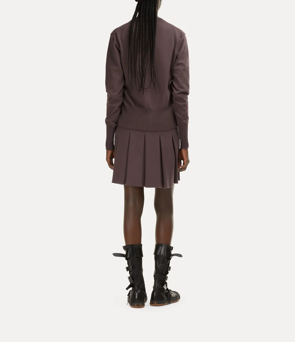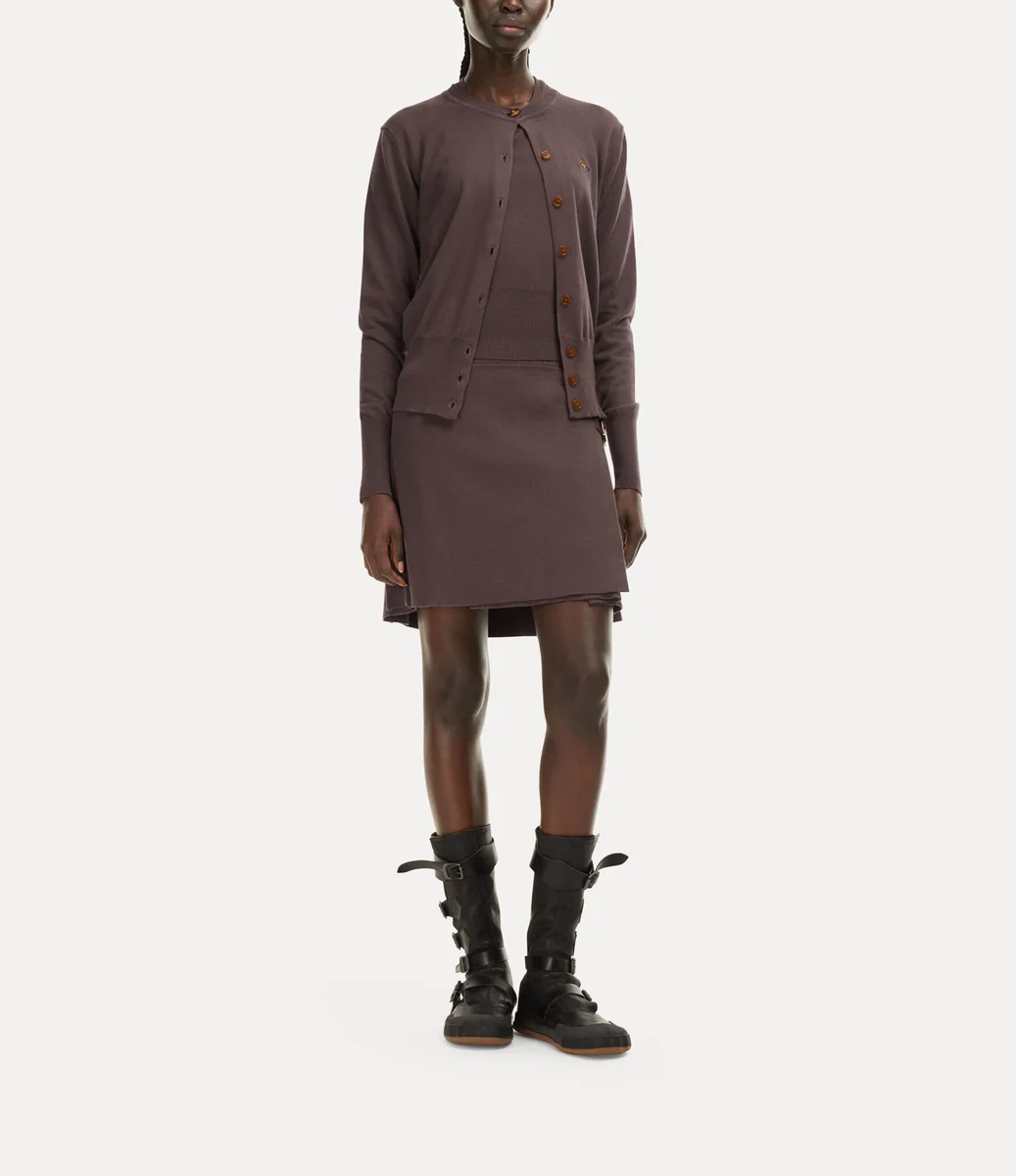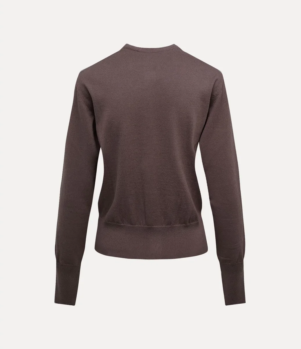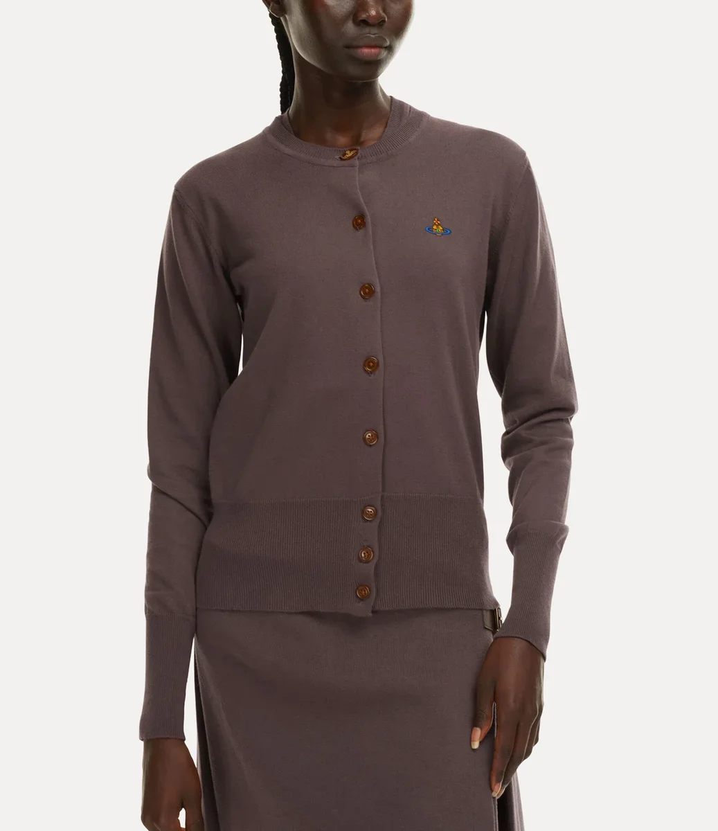 Bea hırkamız, pamuk-kaşmir kaplamalı, yuvarlak yakalı ve dar kesim bir siluete sahiptir. Bu parça, Vivienne’in geleneği geleceğe taşıma vizyonunun simgesi olan, göğsünde işlemeli bir küre ile süslenmiş, markamızın imzası niteliğindeki kehribar rengi düğmelerle bezenmiştir.