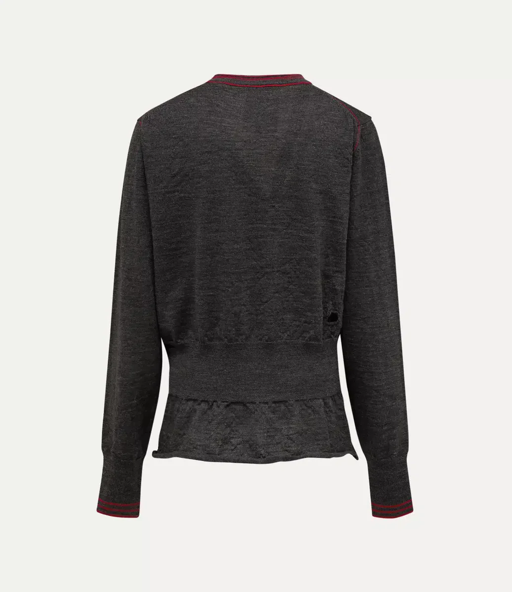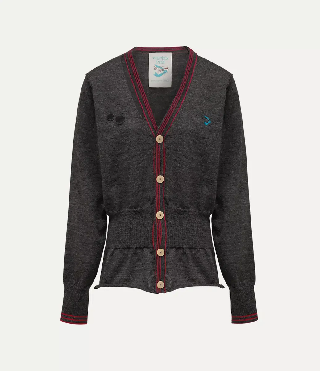 Worlds End Chaos hırkamız, V yakalı, önü düğmeli bir tasarıma sahiptir ve sol göğüste ‘Arm and Cutlass’ detayı ile tamamlanmaktadır. Parça, Vivienne’in ikonik ‘CHAOS’ koleksiyonunu yansıtan ve onun asi ruhunu ve politik geleneklere meydan okuma kararlılığını somutlaştıran kıvrımlı etek ucu ve iki ön kesik ile tamamlanmaktadır.