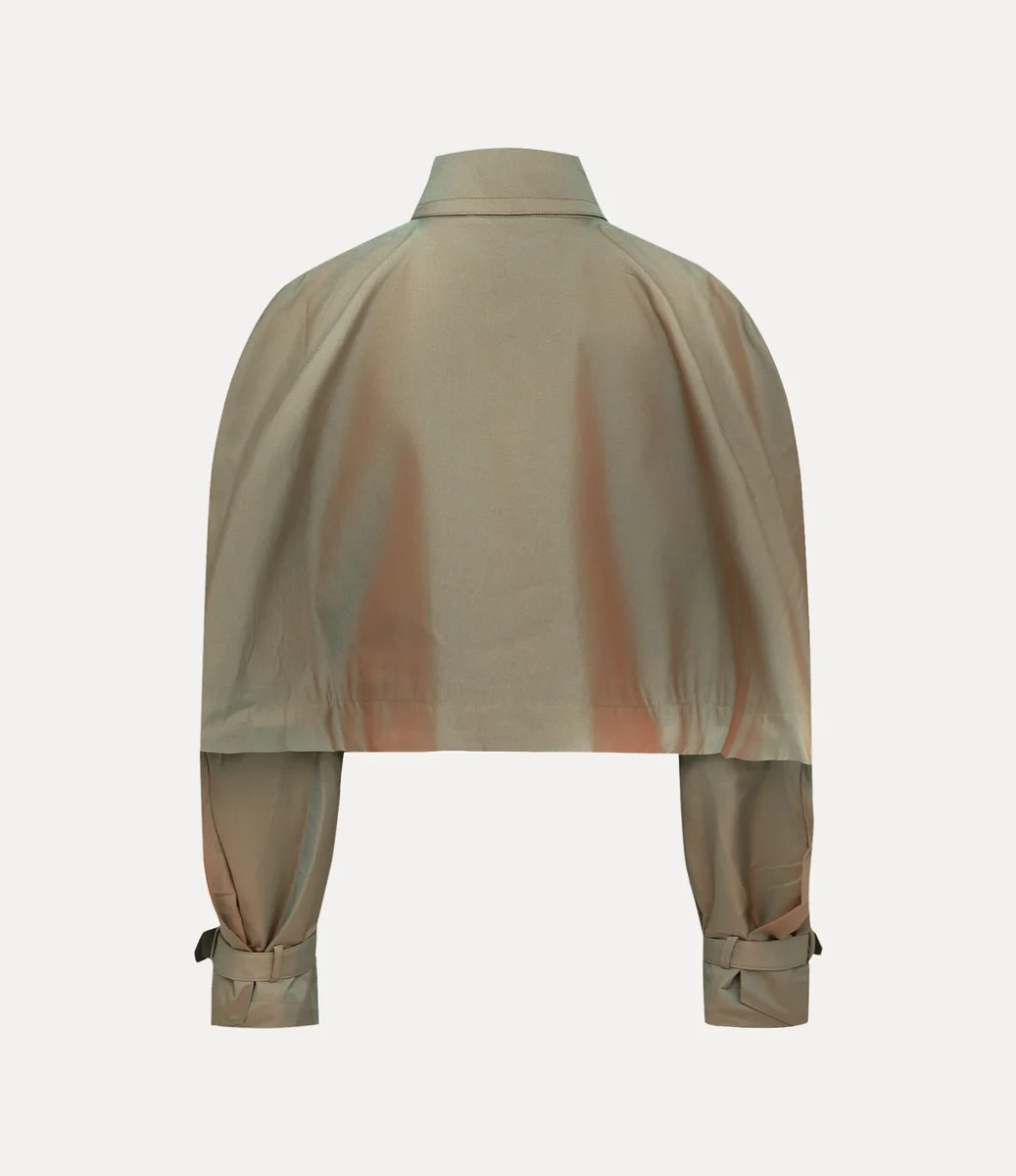 Cut Off Graziano Trençkotumuz, iki tonlu bir kaplama ile yeniden tasarlandı ve yumuşak yeşil-kahverengi yıkama ile yıpranmış, yanardöner bir etki yaratıyor. Hacimli bir siluete sahip olan tasarım, Andreas Kronthaler for Vivienne Westwood Sonbahar-Kış 2022 koleksiyonunda ilk kez tanıtılan arşivsel “Cloud” terzilik sisteminden ilham alıyor.