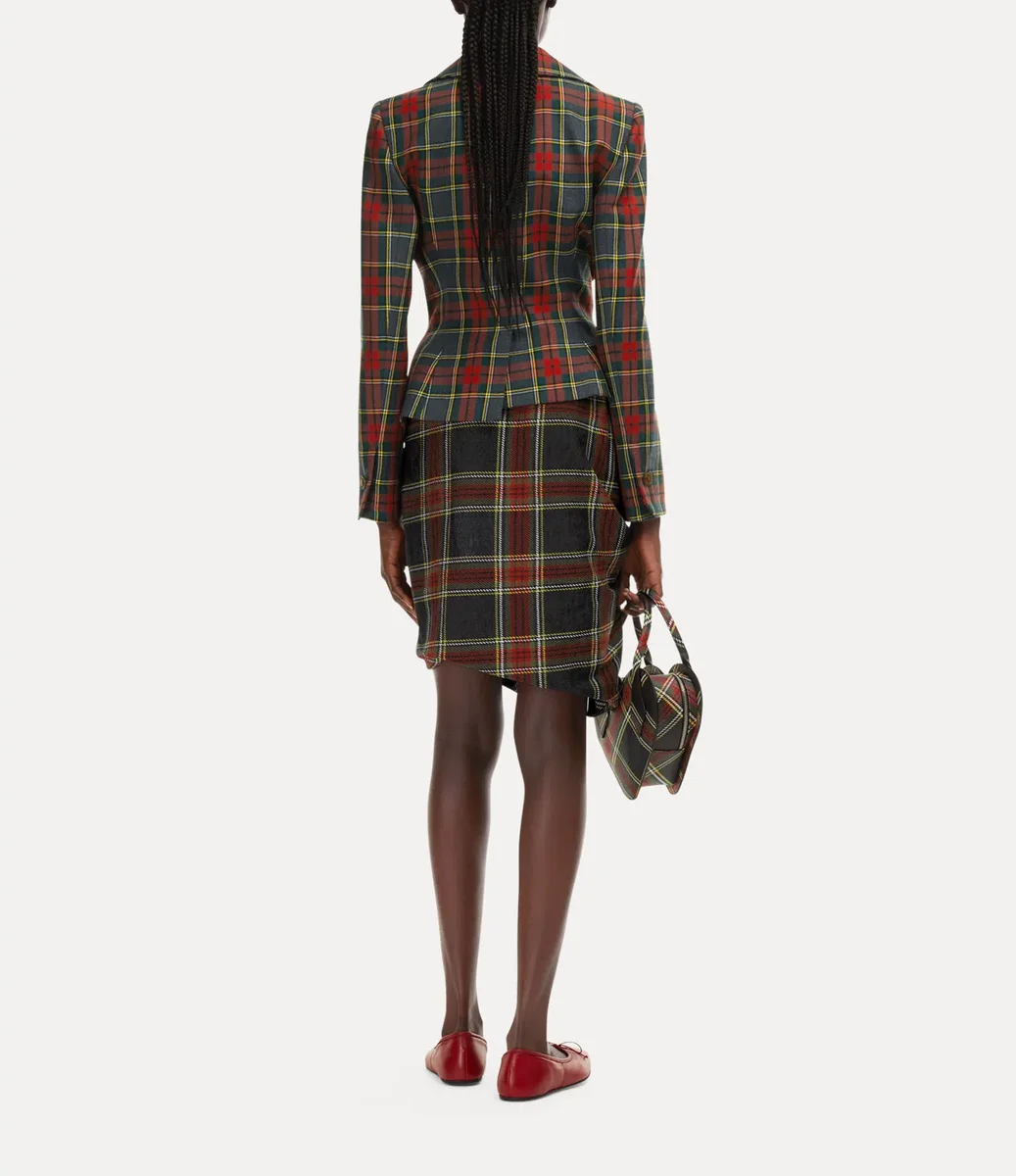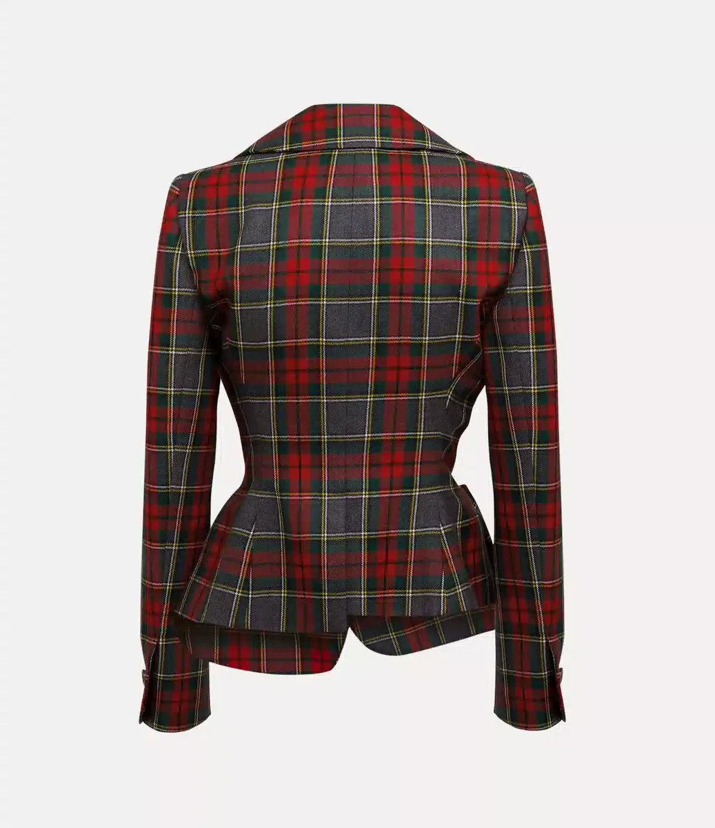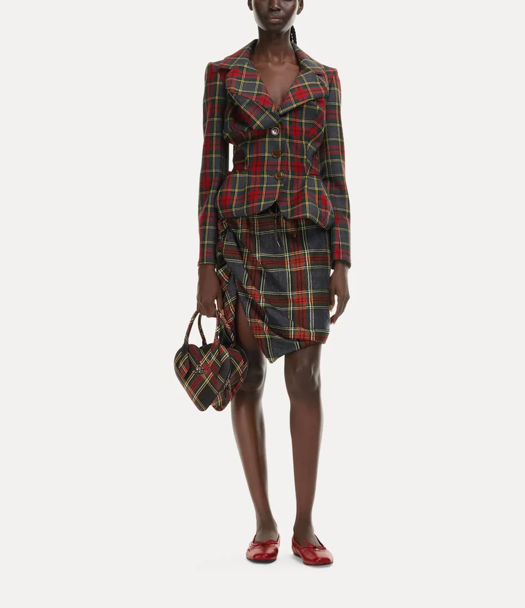 Drunken ceketimiz, Vivienne’in orijinal deneysel sarhoş terzilik kalıp kesim sistemini kullanır – bu sistemde giysi unsurları neredeyse gerçeküstü bir şekil alarak deforme edilir. Bu sezon, parlak ‘Scarlet’ tartan deseniyle sunulan bu parça, ön düğme kapamalıdır.