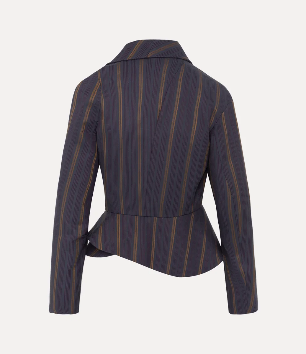 Yumuşak pamuk karışımından üretilen Stormy ceketimiz, drape şal yakalı, lacivert zemin üzerine altın ve bordo renkli ince dikey çizgilerle süslenmiştir. Narin pensler bel kısmını şekillendirerek, heykelimsi peplum etek ucuna uzanırken, iç kısımda eğlenceli “Kahve Lekesi” motifi vurgu yapmaktadır.
