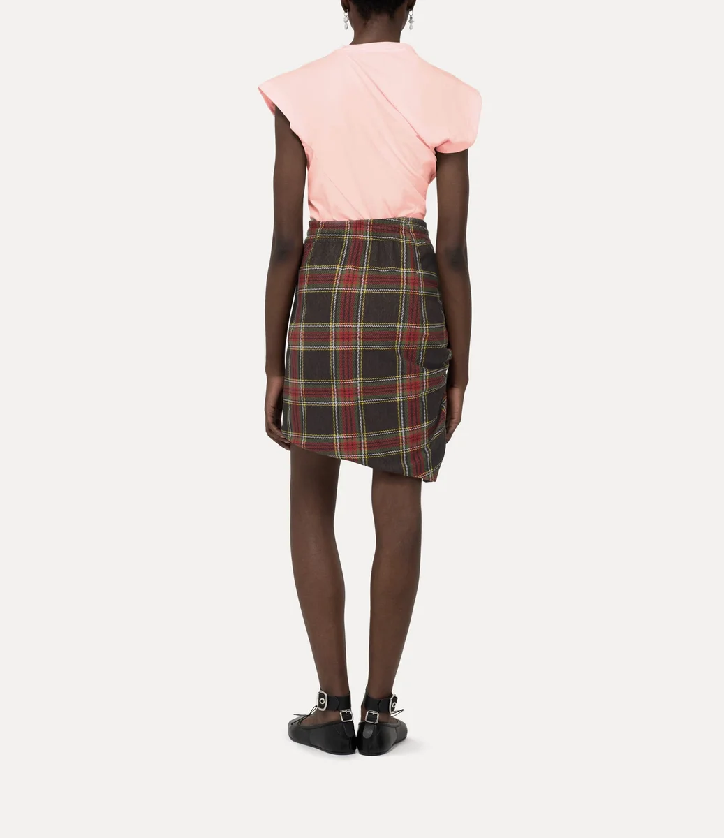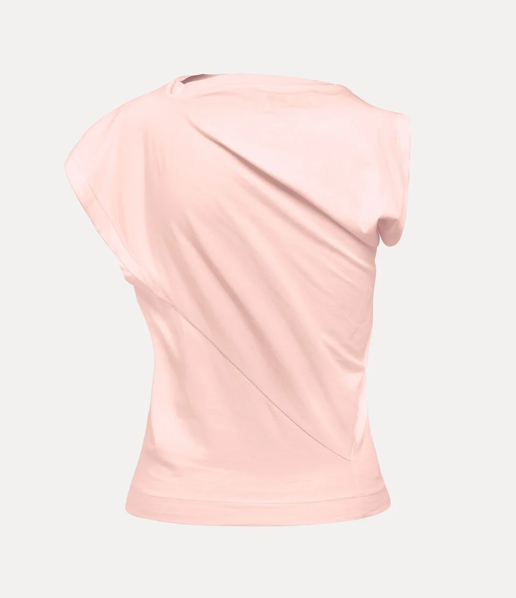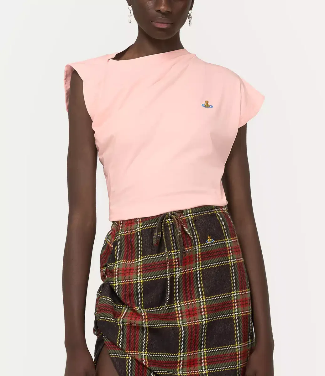 Markanın imzası niteliğindeki Hebo üst, bu sezon yumuşak pamuklu bir yüzey ve göğsün sol tarafında Vivienne’in geleneği geleceğe taşıma vizyonunun simgesi olan küre nakışıyla güncellendi. Silüet, Vivienne’in imzası niteliğindeki kesik ilhamlı yaka, drape detayları ve tasarımın arka kısmındaki bükülmüş kumaşı içeriyor.