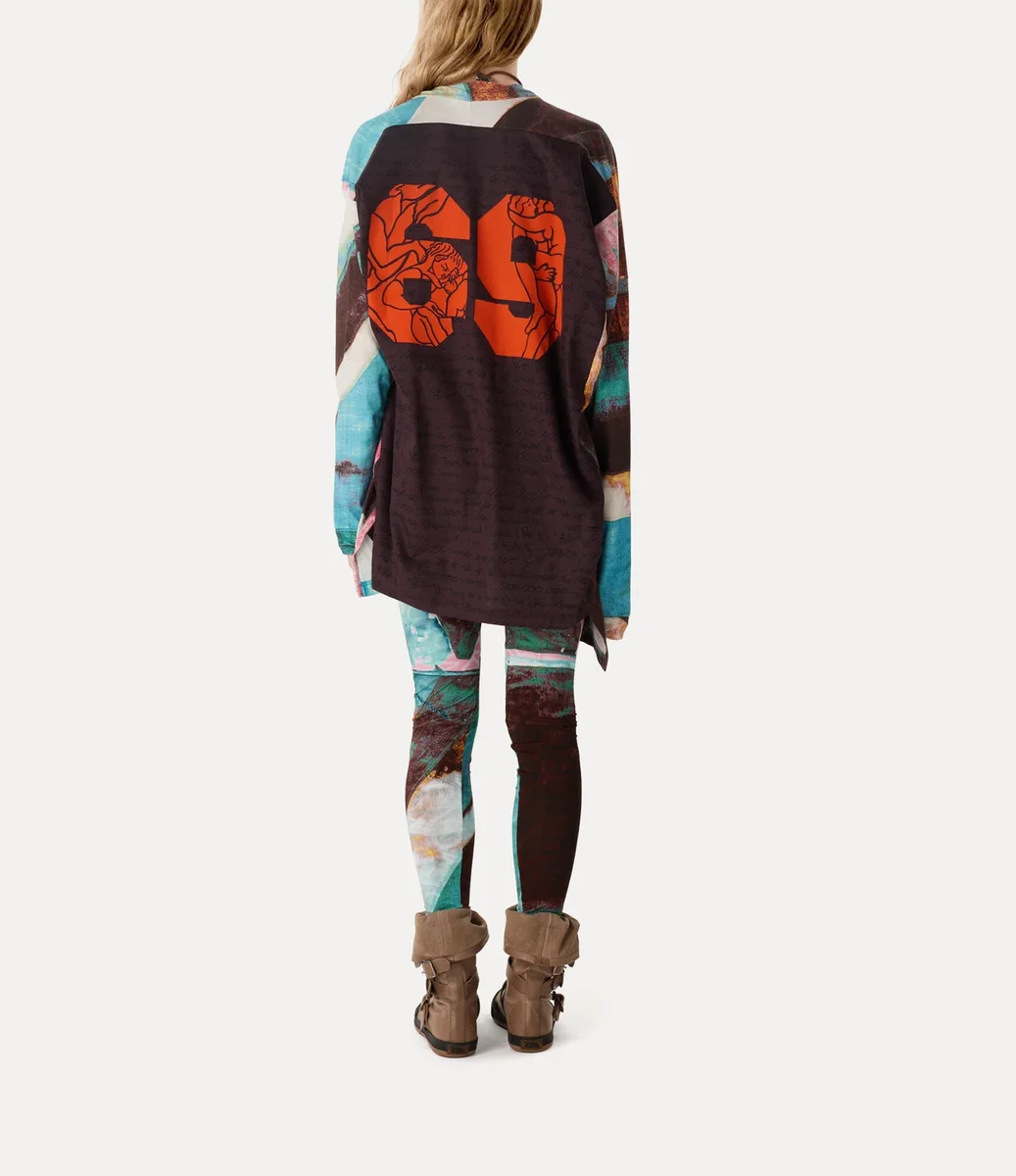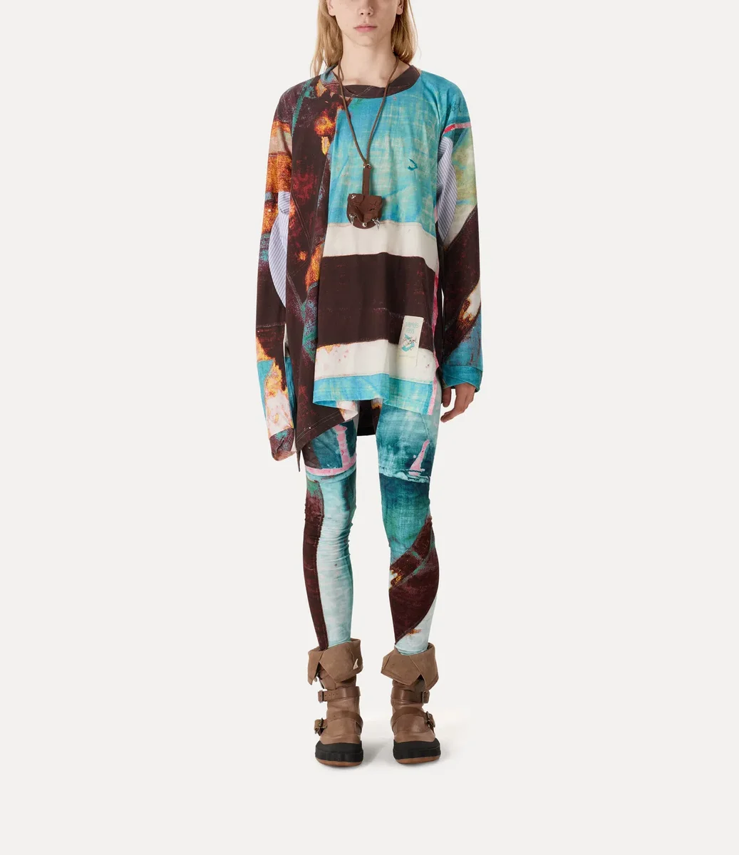Worlds End Drunken üst, yumuşak jarse pamuktan üretilmiştir ve bu sezonun canlı, çok renkli baskısına sahiptir. Uzun kollu ve asimetrik siluete sahip bu üst, boyun çizgisi ve manşetlerinde bükümlü dikişlerle detaylandırılmış ve göğsünde ‘Arm and Cutlass’ arşiv nakışıyla tamamlanmıştır.Arm and Cutlass’ nakış