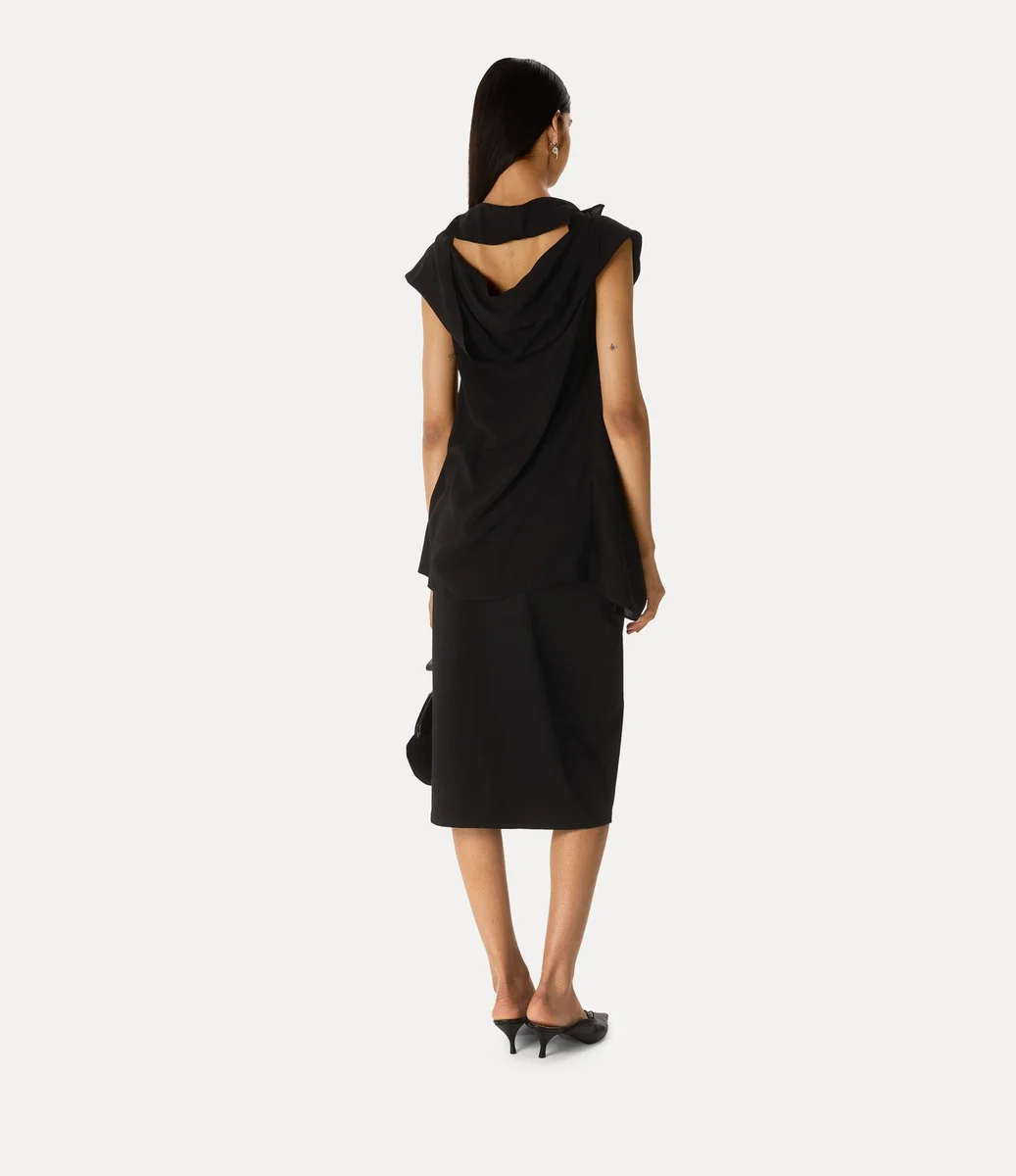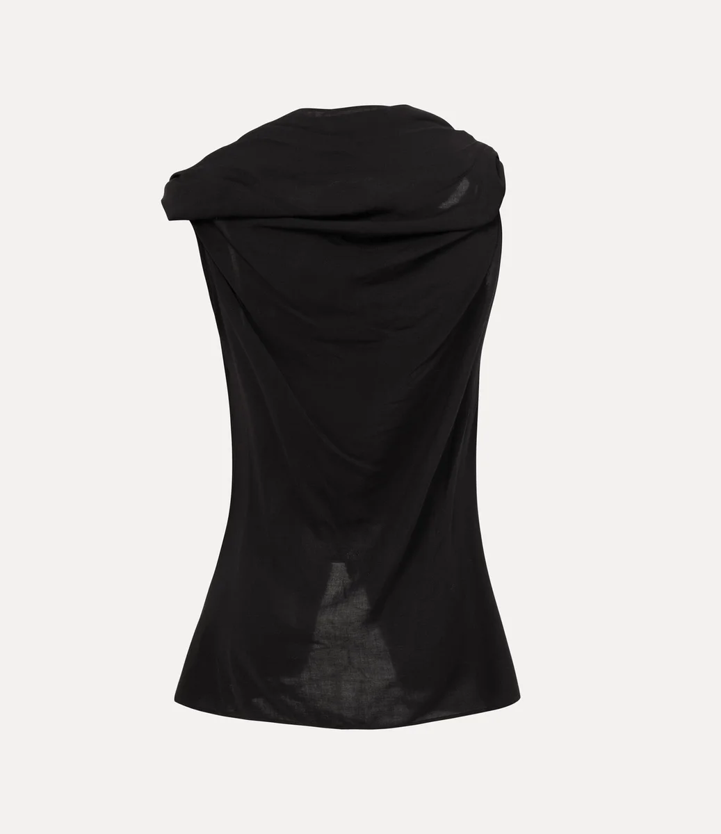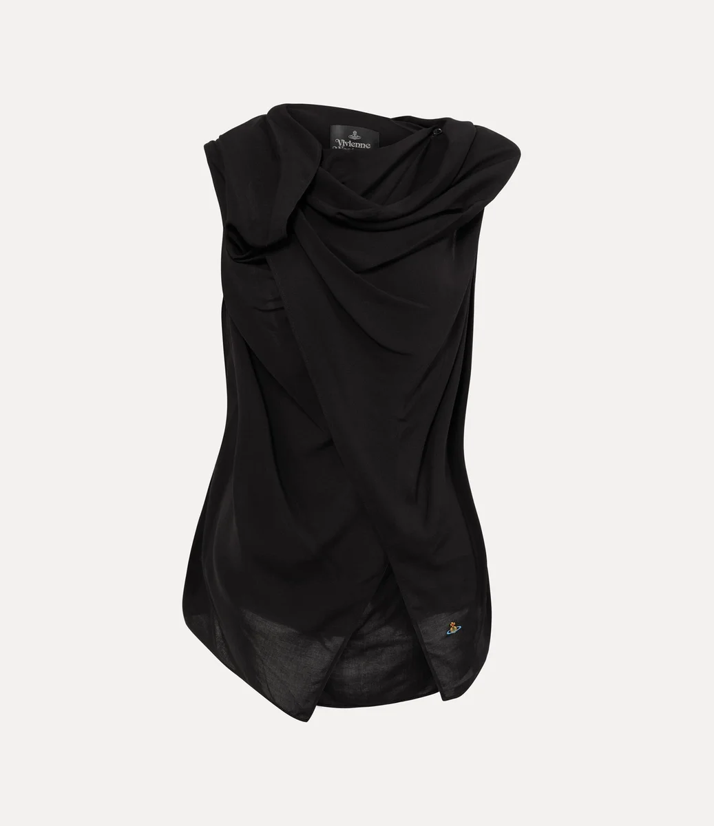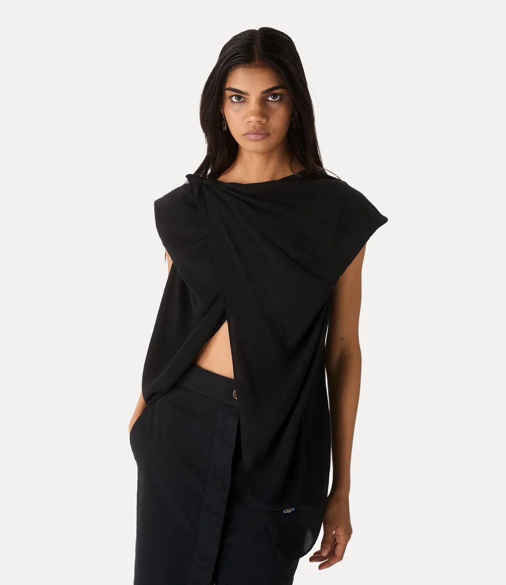 Cross Over üstümüz, vücudu nazikçe saran uzun bir siluetle tasarlanmıştır. Kolsuz kesimli bu parça, asimetrik ön kısmı ve boyun çizgisini çerçeveleyen yumuşak kıvrımlı kapüşonlu yakaya sahiptir.