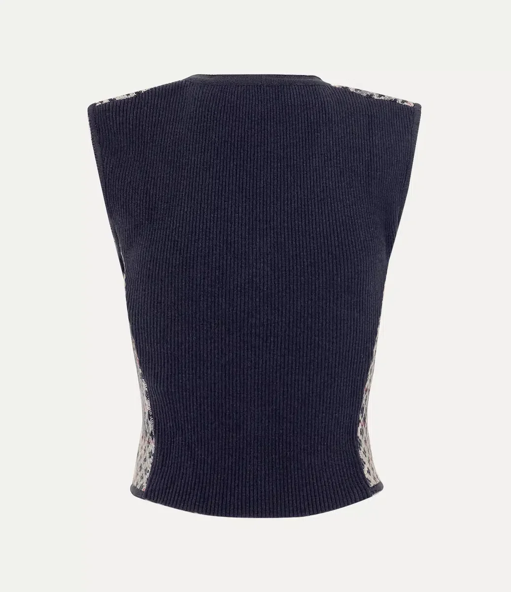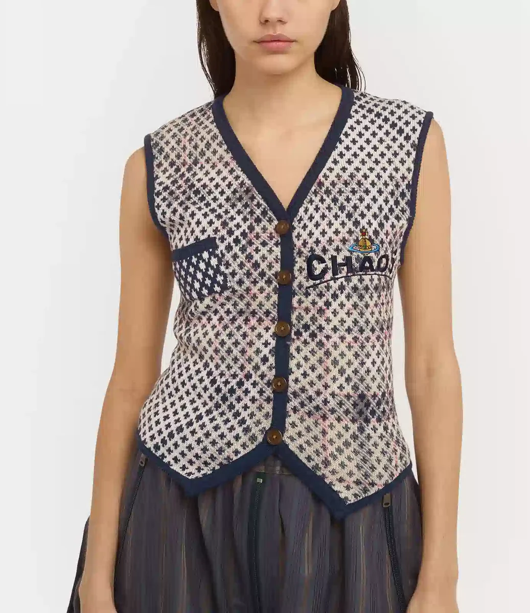 Vivienne Westwood Distressed Tartan yelek, yumuşak pamuk-yün karışımından üretilmiş ve arşivsel Crosses argyle jakar deseniyle süslenmiştir.