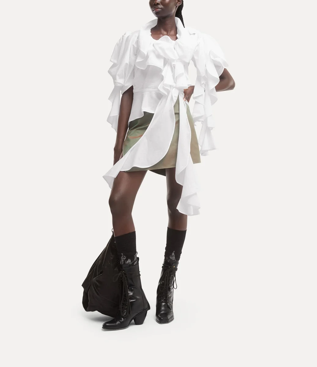 Lola Ruffle üstümüz, hacimli bir siluet yaratmak için vücudu kasıtlı olarak asimetrik bir şekilde sarar ve markanın imza niteliğindeki fiyonk motifleriyle tamamlanır, dalgalı fırfır detaylarıyla süslenir. Belden büzülen bu parça, romantik bir yaka ve yumuşak kabarık kollara sahiptir.